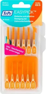 EAN: 4150107320177 - TePe EasyPick ist die einfache und effiziente Lösung für jedermann. Zur täglichen Anwendung für eine frische und gesunde Mundhygiene. EasyPick ist in zwei verschiedenen Größen für eine einfache interdentale Reinigung erhältlich. XS/S - orange: Für sehr schmale bis schmale Interdentalräume. M/L - türkis: Für mittlere bis große Interdentalräume. Ein frisches Gefühl; egal wohin man geht - ein praktisches Taschenetui befindet sich in jedem EasyPick Blister. - bei aponeo.de - aus Yadore Produktdaten Dieses Angebot ist mit 3.75 Euro das günstigste für die GröÃ?e XS/S und somit ideal für preisbewusste Käufer. ![]() ![]() TePe EasyPick XS/S orange