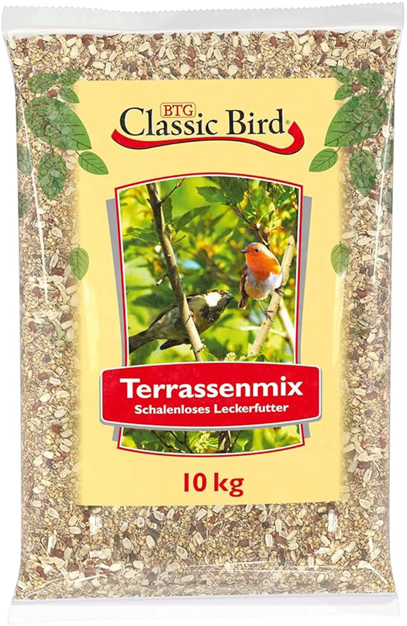 2 Händlerangebote bei billiger.de - Kategorie: Vogelfutter - BTG Classic - BTG Classic Bird Classic Terrassenmix, Samen, 10 kg, Fettfutter, Sonnenblumenkerne geschält , Erdnußkerne BTG Classic Bird Classic Terrassenmix. Produkttyp: Samen, Volumen (g): 10 kg, Inhaltsstoffe: Fettfutter, Sonnenblumenkerne geschält , Erdnußkerne Classic Bird Terrassenmix, 10kg Eine hochwertige und energiereiche Mischung ohne Schalen bietet Classic Bird Terassenmix, schalenlos. Dieses leckere Futter können Sie das ganze Jahr über verfüttern. Zudem hinterlässt es keine Schalenrückstände und eignet sich somit hervorragend für Balkon oder Terrasse. - GTIN:4250016803300 ![]() ![]() BTG Classic CLASSIC BIRD Vogelfutter Terrassenmix 10 kg Schalenloses Ganzjahresfutter mit Erdnusskernen & geschälten Sonnenblumenkernen Premium Wildvogelfutter für Balkon & Terrasse