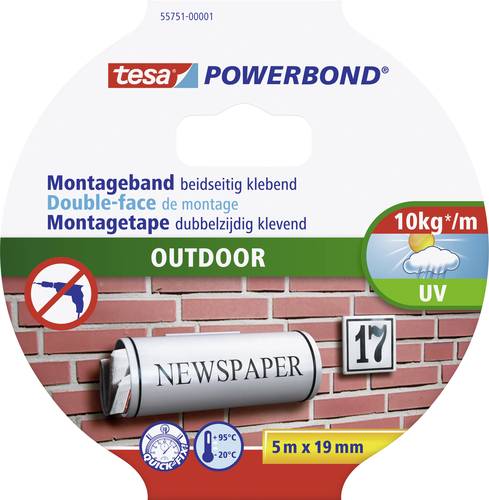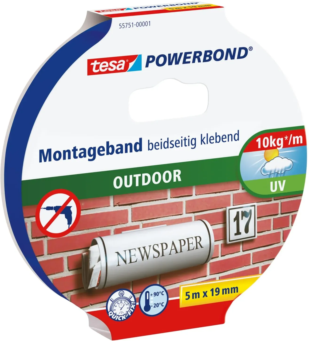 Klebefilme, -bänder Abroller Wohnen Arbeiten Büro- Schreibwaren Büroartikel Klebematerial - - Extra schmales KlebewunderDas doppelseitige Montageband POWERBOND Outdoor 55751 aus dem Hause tesa ist mit einer Breite von 19,0 mm extra schmal, um filigrane Klebe-Arbeiten im Außenbereich auszuführen. Ideal, um Briefkästen oder Hausnummern unsichtbar und permanent zu befestigen - ohne Schrauben, Dübel oder Nägel. Ihre Fassaden werden es Ihnen danken.Doppelter EffektDas Montageband POWERBOND Outdoor 55751 hält, was es verspricht. Beidseitig stark klebend, reiß-, wetter- und wasserfest setzt es sein Können geschickt unter Beweis und steht Ihnen zur Seite. Daher ist es besonders für Kacheln, Klinker, Stein, Metall und die meisten Kunststoffe geeignet.Passt sich anDas doppelseitige Klebeband kann aber noch mehr. Kleine Unebenheiten des Untergrundes gleicht es spielend leicht aus, indem es sich dem Untergrund anpasst. So erhalten Sie immer ein optimales Klebe-Ergebnis.Die Vorteile des tesa doppelseitigen Montageband POWERBOND Outdoor 55751 liegen auf der Hand. Bestellen Sie es noch heute in unserem Online-Shop und überzeugen Sie sich selbst. - Versandkostenfrei: false - Sale: true - - - bei Büroshop24 - gefunden von shopping24 Schaefer-shop.de bietet ein 5 m Band für 10.86 Euro an, was ein sehr guter Preis für die längere Rolle ist. Schaefer- shop.de