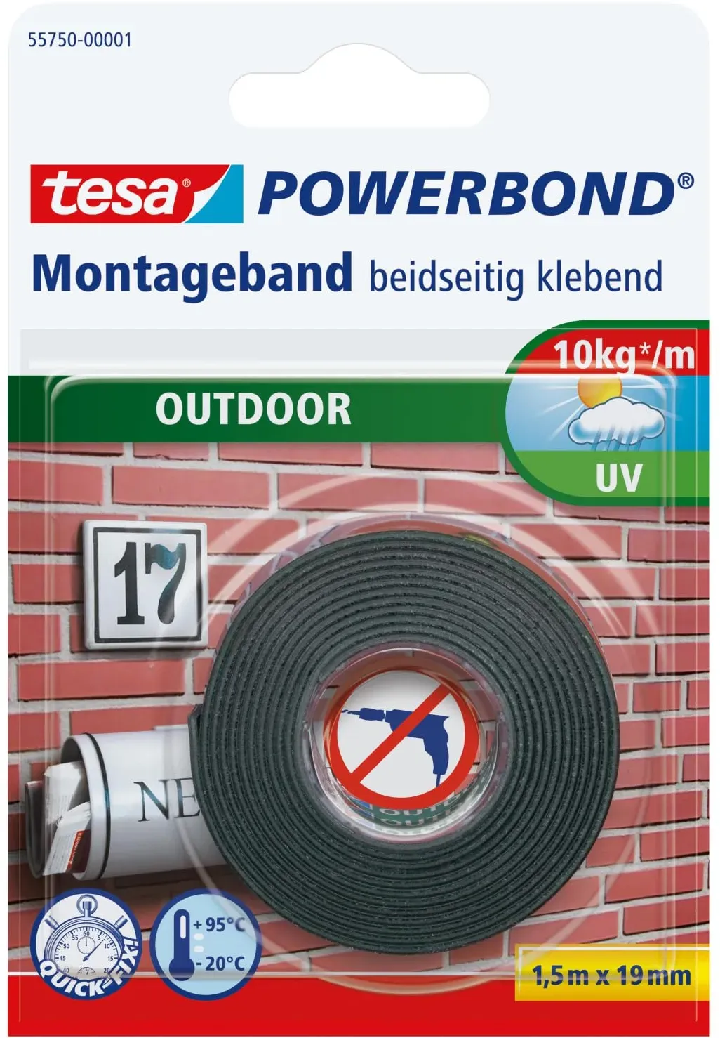 TESA - EAN: 4042448843432 - Bestens geeignet für die Anwendung im Außenbereich ist das UV-beständige tesa Powerbond Outdoor. . Beidseitig stark klebend . Individuell zuschneidbar . UV-, wasser- und temperaturbeständig . Hält bis zu 1 kg pro 10 cm Powerbond . Hält auf Kacheln, Klinker, Stein, Metall und den meisten Kunststoffen . Breite: 19 mm . Länge: 1,5 m . Menge: 1 Rolle - bei reichelt.de - aus Yadore Produktdaten Dieses eBay-Angebot für 8.49 Euro ist eine gute Wahl für das 1,5 m Band, wenn Sie lieber über eBay einkaufen. ![]() ![]() tesa Powerbond - Montageband OUTDOOR eBay 19 mm x 1,5 m