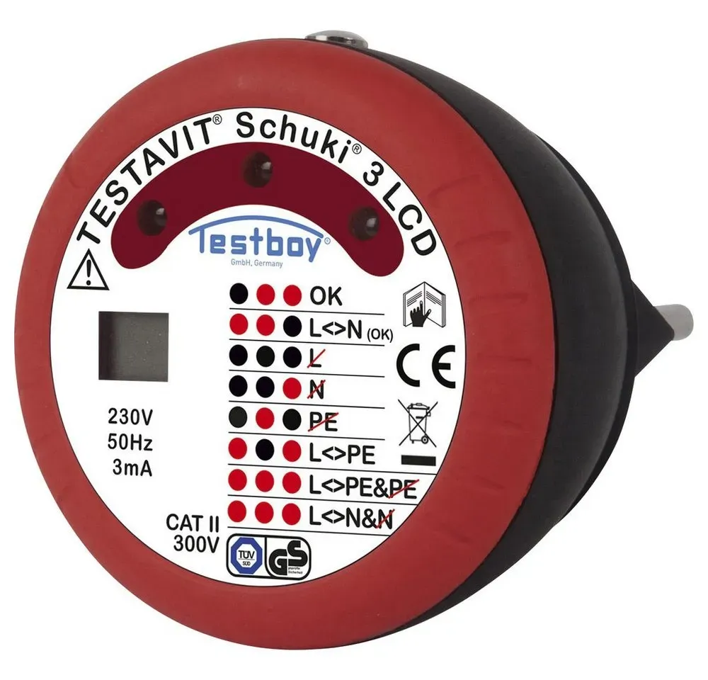 Auf Lager Versand durch AmazonTestavit Schuki 3 LCD Steckdosenprüfgerät und Fingerkontakt zur Überprüfung des Schutzsleiteranschlusses (LED-Anzeige, sichere Überprüfung), Rot/Schwarz
