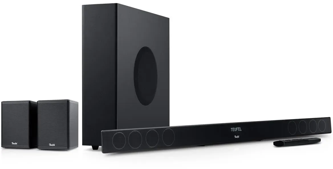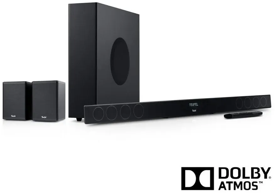 keine Angabe Gewöhnlich versandfertig in 3 bis 4 TagenTeufel CINEBAR PRO Surround Soundsystem 4.1 - Soundbar mit Wireless Subwoofer & Kabellosen aktives Rear-Speakers, WLAN, Dolby Audio, Bluetooth, HDMI ARC CEC, 4K - schwarz
