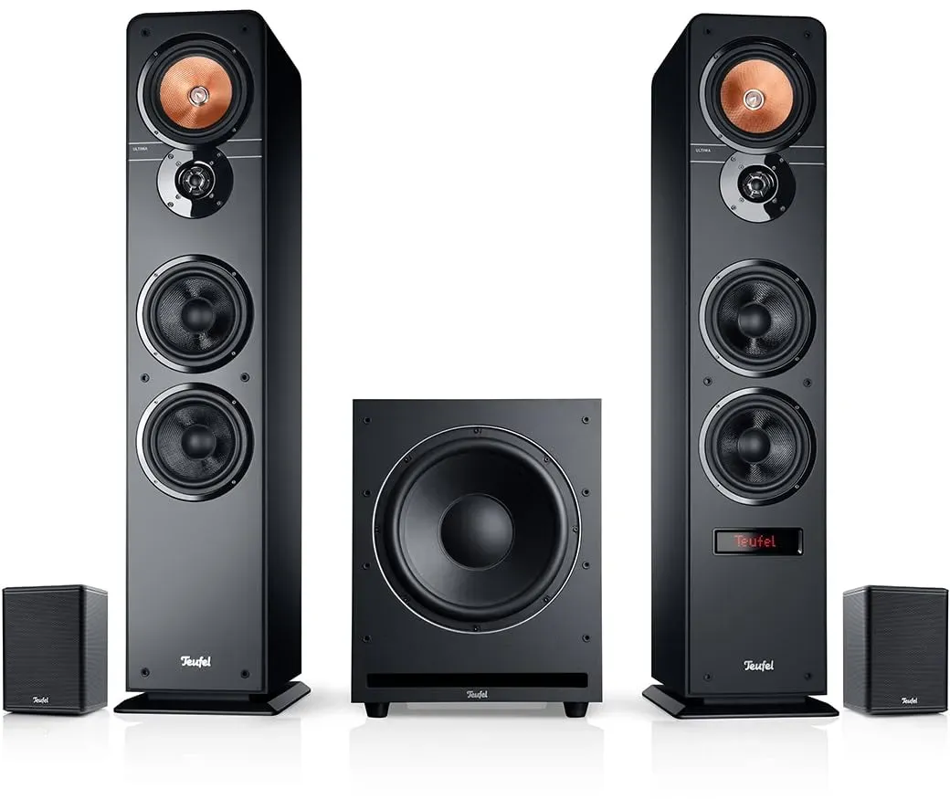 Kategorie: Surround-Systeme - Teufel - GTIN:4048945584274 - 5.1-Heimkino-Set mit mehr Bass und Stand-Lautsprecher ULTIMA 40 (Passive Lautsprecher) Power Edition mit riesigem S 6000 Subwoofer für mehr Bass in großen Räumen, optional kabellos ansteuerbar Heimkino-, Musik- und Gaming-Sound auf hohem Niveau mit imposanter klanglicher Einhüllung und präziser Ortung aller Schallereignisse Hochtöner mit Phase-Plug für eine optimierte Klangabstrahlung bei ausgewogenem Klang 3-Wege-System mit zwei hoch belastbaren Tieftönern für hohe, verzerrungsfreie Pegel ULTIMA 20 als Rear-Speaker, Center mit doppeltem Mitteltöner für eine sehr gute Sprachverständlichkeit Großer 25-mm-Hochtöner mit Phase-Plug und Waveguide für eine detaillierte, räumliche Darstellung Für jeden AV-Receiver geeignet, passend für Standfuß, Regal oder Wandanbringung - 994,99 Euro bei Amazon Marketplace CE - gefunden von billiger.de Dieses kabellose Surround-Set bietet Flexibilität bei der Aufstellung der Lautsprecher und reduziert den Kabelsalat. ![]() Teufel.de
