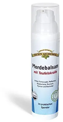 Kategorie: Medizinische Körperpflege - das gute aus dem inntal - GTIN:4260354032621 - Eine pflanzliche Kräuterkombination mit Arnika, sibirischer Fichtennadel, Pfefferminz, Rosskastanie, Thymian, Wacholder, Rosmarin, Avocadoöl und der Teufelskralle. Unterstützt die Entspannung und Erholung von Muskeln und Gelenke. Durch den Zusatz von Teufelskralle wurde dieser Balsam noch einmal verbessert. frei von Farbstoffen, Emulgatoren und Parfüm ideal auch nach dem Sport oder körperlichen Anstrengungen - 8,95 Euro bei Amazon Marketplace Health & Personal Care - gefunden von billiger.de ![]() ![]() Pferdebalsam mit Teufelskralle 75 ml im Spender