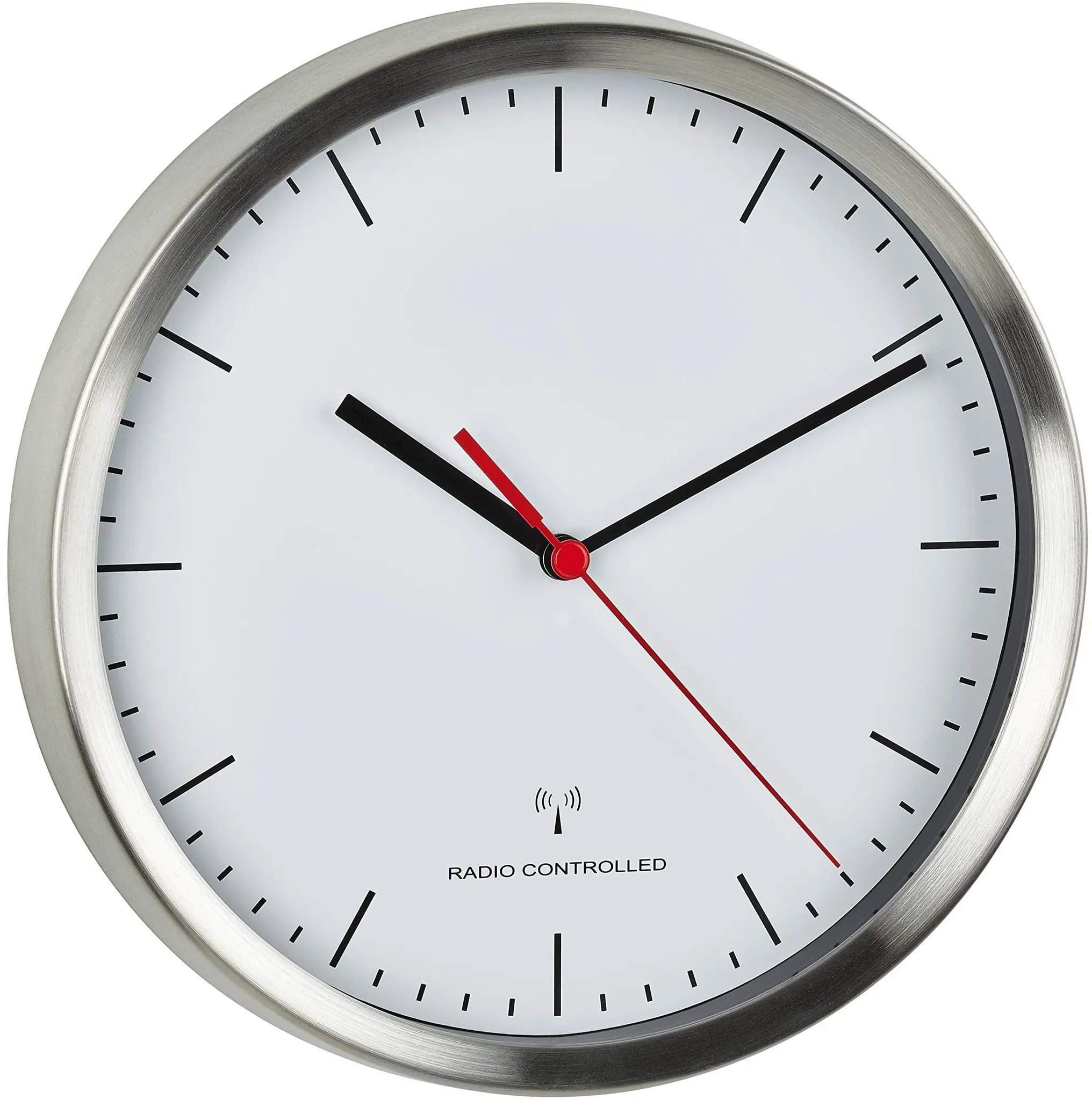 Auf Lager Versand durch AmazonTFA Dostmann Analoge Funk-Wanduhr, 60.3521.02, Rahmen aus Edelstahl, leises Uhrwerk, höchste Genauigkeit, silber, Weiß, L 305 x B 48 x H 305 mm