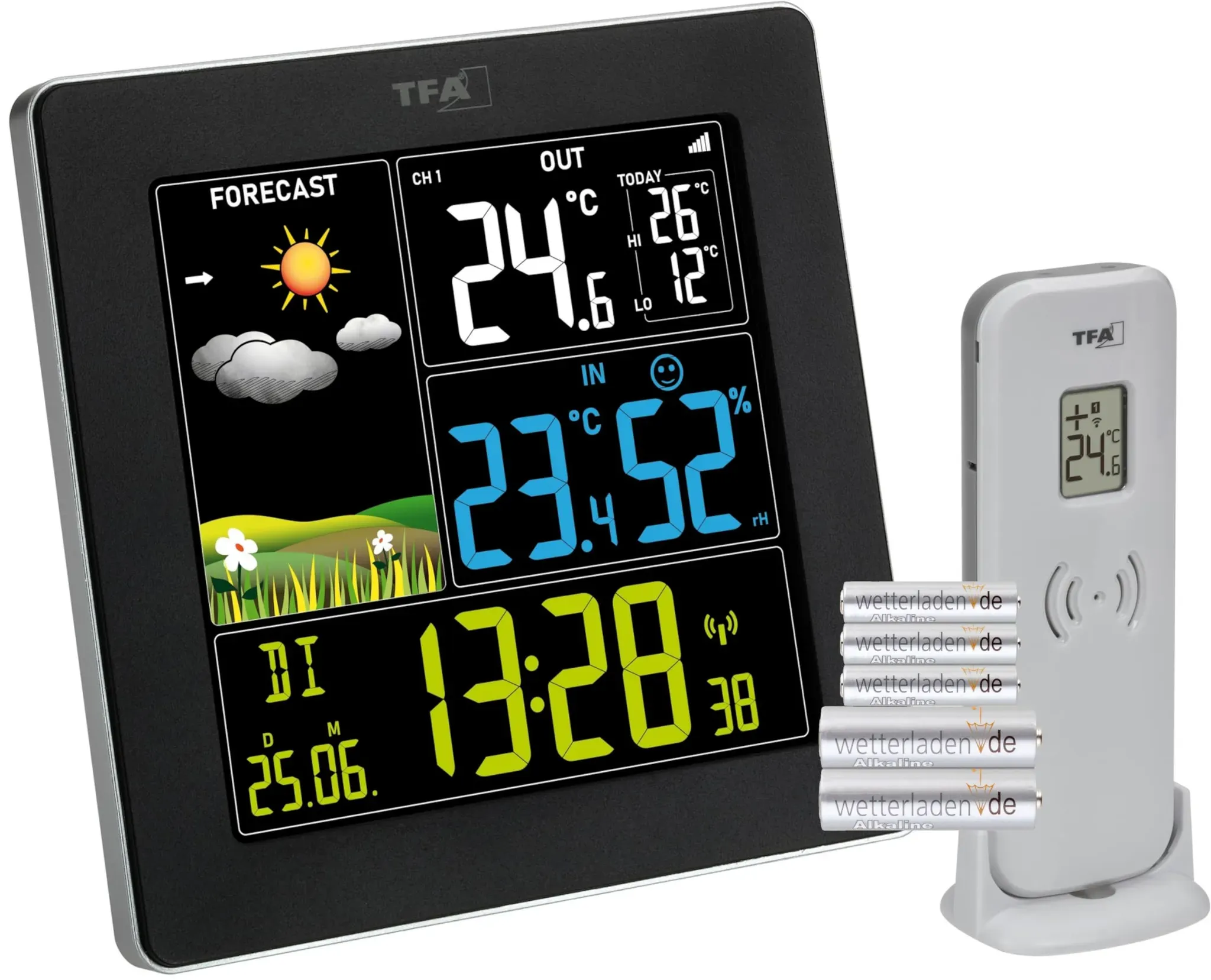 Kategorie: Wanduhren - TFA - GTIN:4250944721073 - Das Design der Uhr ist zeitlos und anpassungsfähig. So fügt sie sich harmonisch in nahezu jede Umgebung ein. Das Ziffernblatt mit farbigem Sekundenzeiger ist groß und gut ablesbar. Die Uhr besitzt eine wertige Glasabdeckung. Die TFA Funk-Wanduhr empfängt die Uhrzeit über das DCF 77 Signal. Damit wird die aktuelle Uhrzeit stets auf die Sekunde genau angezeigt und es entfällt die Umstellung von Sommer- auf Winterzeit. Inklusive Batterie. Abmessungen: (L) 330 x (B) 50 x (H) 330 mm - 26,99 Euro bei Amazon Marketplace Home - gefunden von billiger.de Diese Funk-Wetterstation ist mit 38,99 Euro ein umfassendes Gerät mit Farbdisplay, Innen- und Außentemperatur, Hygrometer und Funkuhr. ![]() ![]() TFA Dostmann Wetterstation Funk mit Außensensor SUN2 digital, 35.1174, für Innen und Außentemperatur, großes Farbdisplay, Wohnklima, Funkuhr mit Datum, Hygrometer, mit Netzteil, schwarz mit Batterien