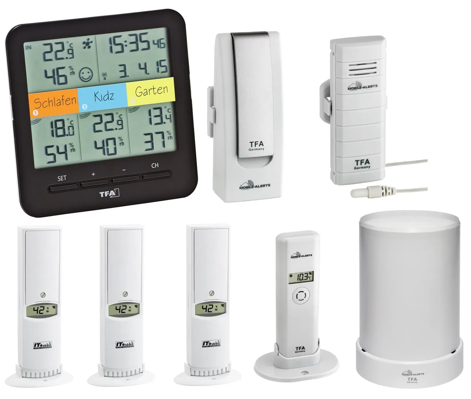 Verfügbarkeit: Auf Lager - Kategorie: Wetterstationen - TFA - GTIN:4250944709620 - Sparset incl. WeatherHub SmartHome System 31.4002.02, Klima@Home 30.3060.01, Regenmesser 30.3306.02, Zusatzsender 30.3303.02 Raumklima wichtig für die Gesundheit Die Kontrolle von Innentemperatur und Luftfeuchtigkeit durch gezieltes Heizen und Lüften schafft ein behagliches und gesundes Wohnklima und spart sogar Heizkosten. Ideal ist eine Innentemperatur von 18°C...22°C und eine relative Luftfeuchtigkeit von 40...60%. Ideal zu Raumklimaüberwachung in verschiedenen Räumen Einfache übersicht über die Messwerte durch individuelle Beschriftung 3 Funksender für Temperatur und Luftfeuchtigkeit Inklusive Mit Funkuhr und Datum Verbindung zu WeatherHub Durch die Verbindung mit dem WeatherHub SmartHome System lassen sich die Anzeigen des Klima@Home ganz einfach mit dem Smartphone abrufen, egal wo Sie gerade sind. - 194,99 Euro bei Amazon Marketplace Lawn & Garden - gefunden von billiger.de Dieses professionelle Starterset ist speziell für anspruchsvolle Anwendungen wie in Apotheken, Laboren oder Lagern konzipiert. ![]() ![]() TFA-Dostmann Weatherhub Observer Starterset Profi TFA 31.4010.99 Starterset für Apotheken/Medizin/Labor/Lager