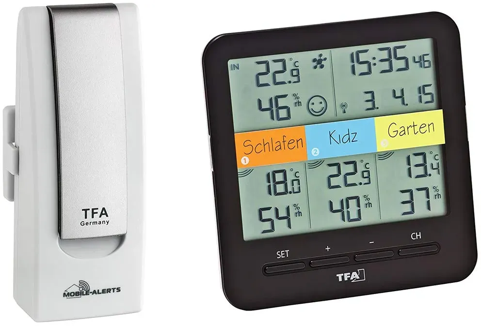 Verfügbarkeit: Auf Lager - Kategorie: Wetterstationen - TFA - GTIN:4250944715362 - Batterien 9x 1.5V AA inklusive überwachen Sie mit dem Klima@Home Funk-ThermoHygrometer gleichzeitig 4 Messstellen für Temperatur und Luftfeuchtigkeit. So sehen Sie das Klima am Aufstellort und zusätzlich noch in drei weiteren Räumen. Die Kontrolle von Innentemperatur und Luftfeuchtigkeit durch gezieltes Heizen und Lüften schafft ein behagliches und gesundes Wohnklima und spart sogar Heizkosten. Durch die Verbindung mit dem WeatherHub SmartHome System lassen sich die Anzeigen des Klima@Home ganz einfach mit dem Smartphone abrufen, egal wo Sie gerade sind. 3 Funksender für Temperatur und Luftfeuchtigkeit inklusive - 119,99 Euro bei Amazon Marketplace Lawn & Garden - gefunden von billiger.de Ein Profi-Set mit Funk-Thermo/Hygro-Station, Regenmesser und Zusatzsender, das eine sehr detaillierte Klimaüberwachung ermöglicht. ![]() ![]() TFA Dostmann KlimaHome Profi TFA 30.3060 Funk-Thermo/Hygro-Station incl. WeatherHub SmartHome System, Regenmesser und Zusatzsender (schwarz)