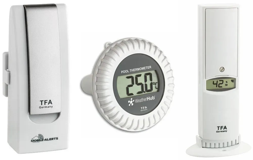 Verfügbarkeit: lieferbar-in 2-3 Werktagen bei dir - Kategorie: Wetterstationen - TFA - GTIN:4250944710442 - TFA Dostmann Raumthermometer Hygrometer Weatherhub Starterset Raumklimakontrolle TFA 31.4000.02.99 - 71,49 Euro bei OTTO - gefunden von billiger.de Ein spezielles Pool-Set zur Temperaturkontrolle, das sich auch für die Teichüberwachung eignet. ![]() ![]() TFA Dostmann Weatherhub SmartHome Pool-Set 30 TFA 31.4000.02.30 Pool-Temperatur Kontrolle Teichüberwachung
