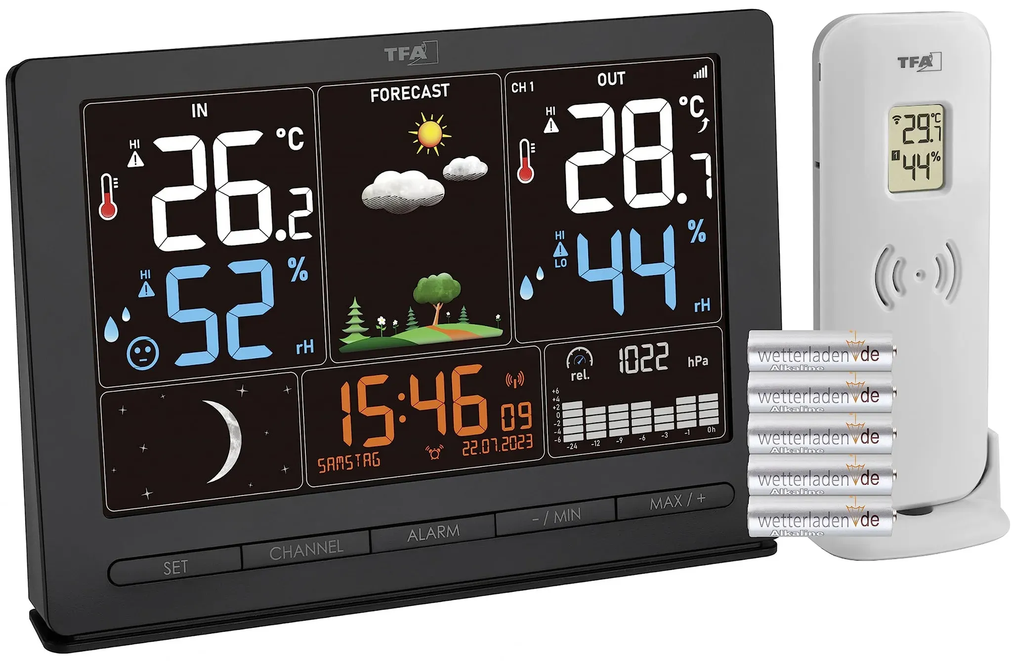 Auf Lager Versand durch AmazonTFA Dostmann Funk-Wetterstation Season 2, 35.1118, mit Außensender, Wettervorhersage, Farbdisplay, Temperatur und Luftfeuchtigkeit, inkl Funkuhr mit Mondphase, schwarz, mit Batterien