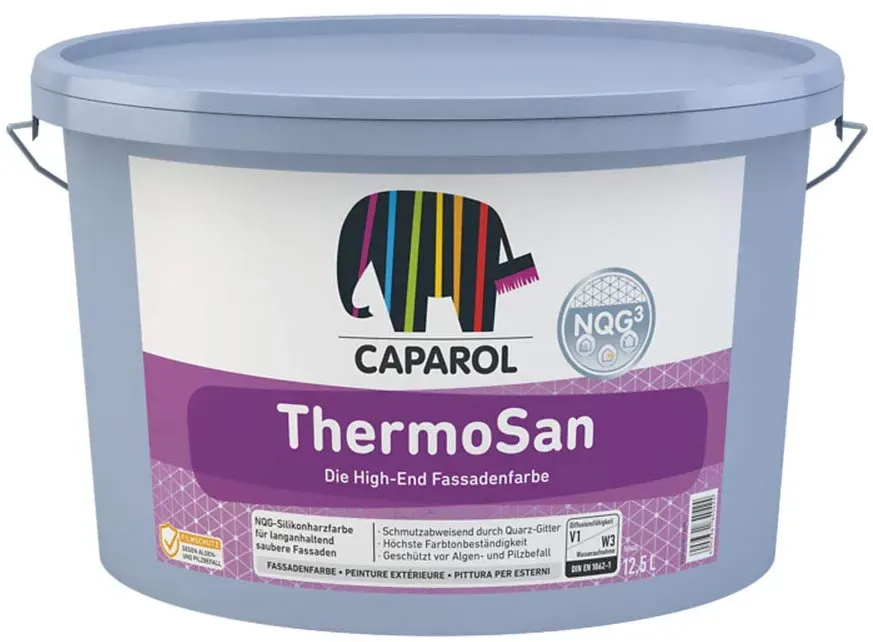 Kategorie: Farben & Lacke - Fassadenfarbe ThermoSan NQG3 - GTIN:0978542335662 - neuartige Siliconharz-Bindemittelkombination mit integrierter Nano-Quarz-Gitter-Struktur für saubere, schnellabtrocknende Fassaden ThermoSan ist gegen Algen- und Pilzbefall geschützt Kombination aus Siliconharz-Emulsion und neuartigem Hybrid-Bindemittel auf anorganisch/organischer Basis schmutzabweisend, höchste Farbtonbeständigkeit, hoch CO2-durchlässig - 175,00 Euro bei Amazon Marketplace Home Improvement - gefunden von billiger.de Diese Fassadenfarbe bietet eine weitere hochwertige Option für den Außenbereich mit Nano-Quarz-Gitter-Technologie. ![]() ![]() Caparol ThermoSan NQG 12,5 Liter, Weiß