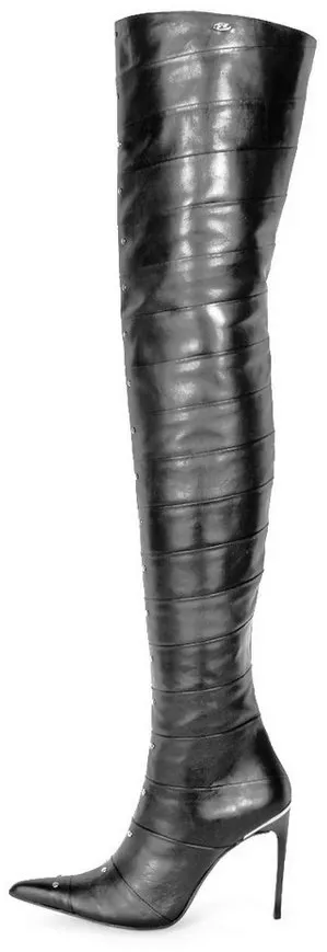 Dieses Angebot ist ein Beispiel für Angebote, die kürzlich auf dem eBay-Marktplatz in der Kategorie 260033 verfügbar waren. Bitte aktualisieren Sie die Suchergebnisse um aktuelle Angebote zu erhalten. Ein luxuriöser Thigh High Stiefel aus segmentiertem Leder mit Nietenapplikationen und Stiletto-Heels, der ein exklusives Statement setzt. ![]() ![]()