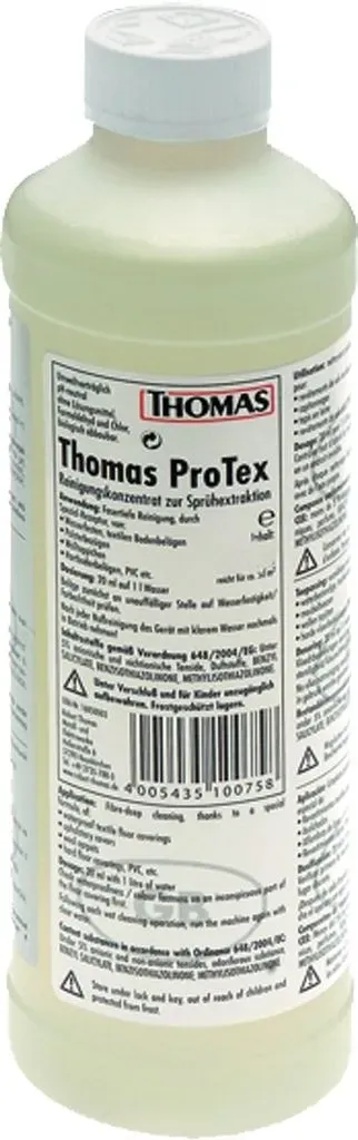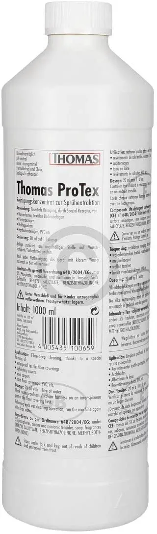 THOMAS ProTex eignet sich für die fasertiefe Reinigung von Teppichen, Polsterbezügen, Wollteppichen und auch Hartböden (PVC etc.). Es löst Schmutz und bietet einen faser-schützenden Effekt, der schnelles Wiederanschmutzen verhindert. Das Konzentrat ist für alle THOMAS Waschsauger und Wasch-Dampfsauger geeignet. Dosierung: Meist 20 ml auf 1 Liter Wasser. ? Beliebte Produktmerkmale