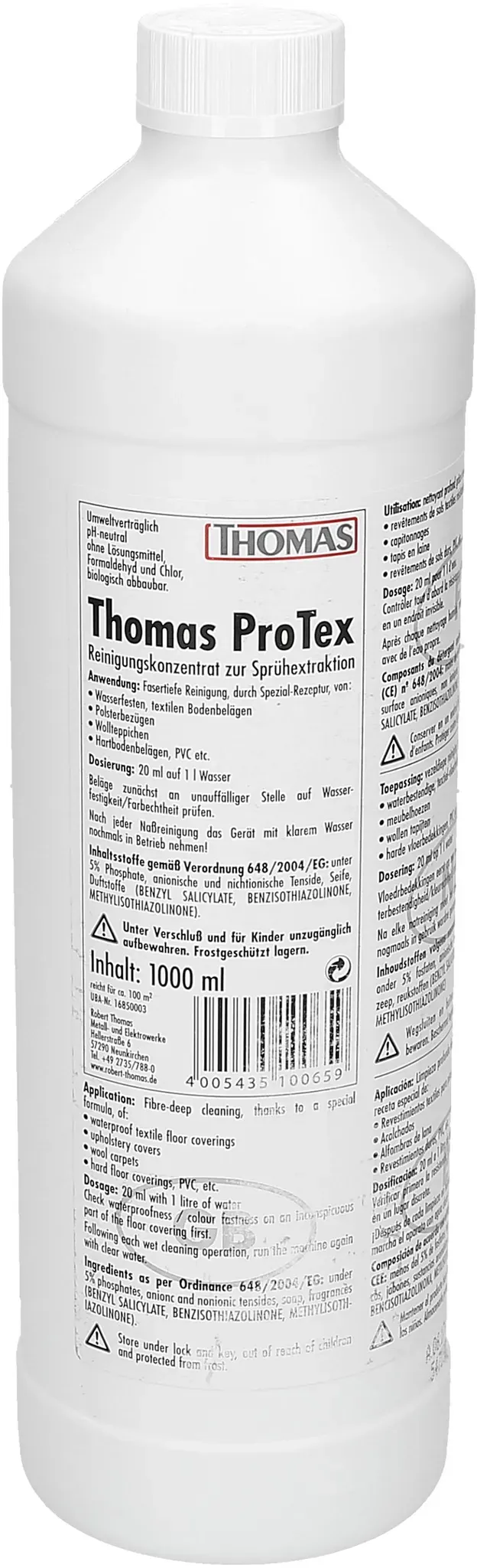 THOMAS - EAN: 4005435102837 - Fasertiefe Reinigung Von Wasserfesten, Textilen Bodenbelägen, Polsterbezügen, Wollteppichen Und Hartbodenbelägen Wie Fliesen Und Pvc Durch Eine Spezielle Rezeptur. Protex Einfach Mit In Das Frischwasser Des Thomas Staub- Und Waschsauger, Waschsauger Oder Multisauger Geben Und Sprühextraktion Starten. Das Reinigungskonzentrat Wird Mit Druck Auf Die Betroffene Stelle Aufgesprüht Und Im Gleichen Arbeitsgang Wieder Abgesaugt. Für Eine Fasertiefe Reinigung. - bei mediamarkt.de - aus Yadore Produktdaten Dieses Reinigungskonzentrat ist mit 10,75 Euro ein gutes Angebot von einem vertrauenswürdigen Händler auf Amazon. ![]() ![]() Thomas Reinigungsmittel ProTex Reinigungskonzentrat