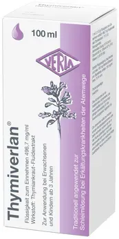 62.50 / 1 l - Kategorie: Arzneimittel - Verla-Pharm Arzneimittel GmbH & Co. KG - GTIN:4150141653316 - PZN:14165331 - 14165331: Verla-Pharm Arzneimittel GmbH & Co. KG - THYMIVERLAN Flüssigkeit zum Einnehmen 100 ml - 6,25 Euro bei ayvita.de - gefunden von billiger.de Dieses Angebot von medpex.de ist eine gute Option für die 100 ml Flasche. ![]() ![]()