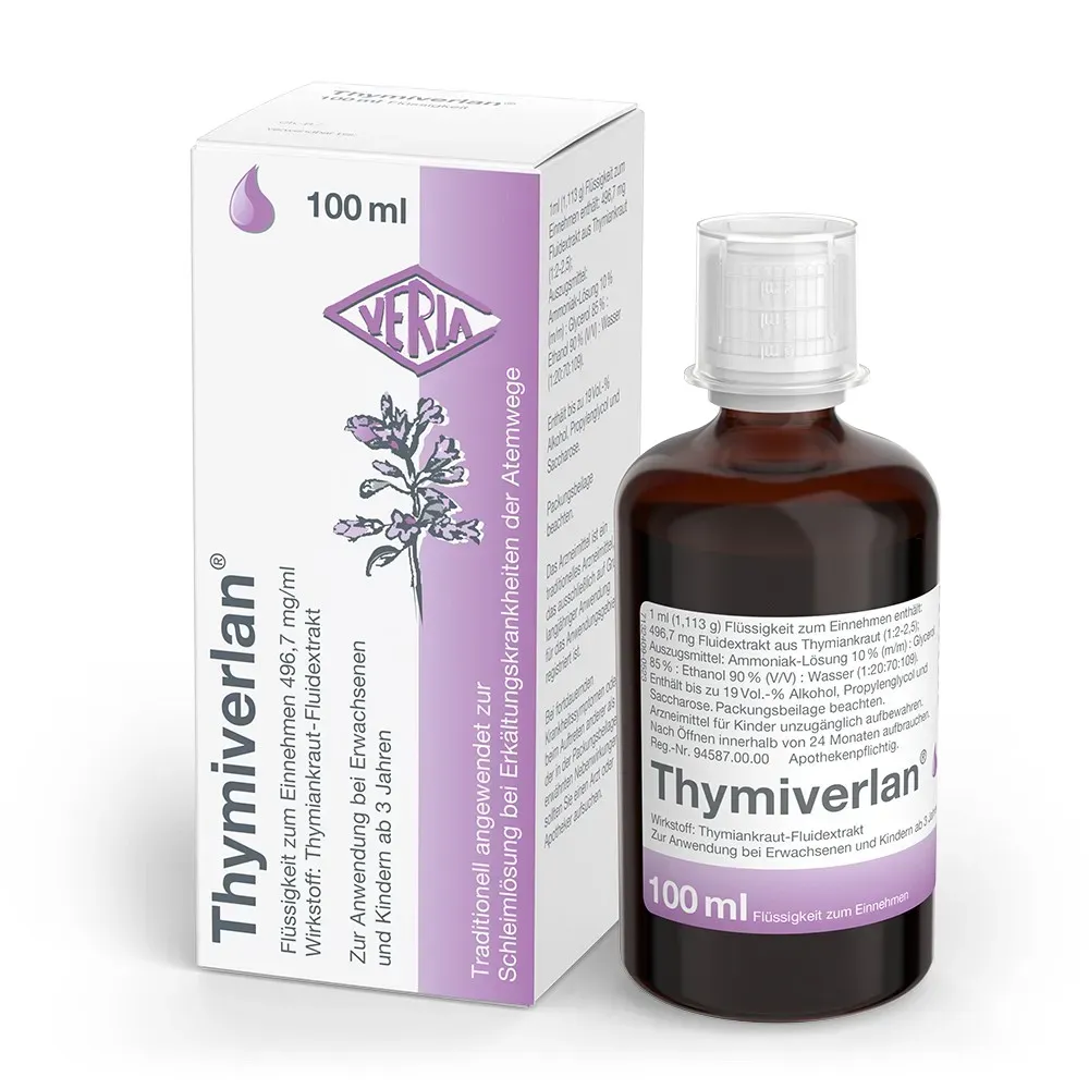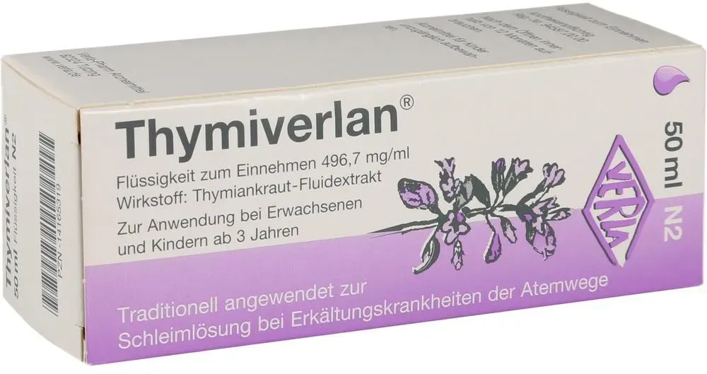 83,80 /l - Kategorie: Arzneimittel - Verla-Pharm Arzneimittel GmbH & Co. KG - GTIN:4150141653194 - PZN:14165319 - Wirkstoff: Thymiankraut-Fluidextrakt. Anwendungsgebiete: Traditionelles pflanzliches Arzneimittel zur Anwendung (zur Schleimlösung) bei Erkältungskrankheiten der Atemwege mit produktivem Husten, ausschließlich auf Grund langjähriger Anwendung. Hinweis: Enthält bis zu 19 Vol.-% Alkohol, Propylenglycol und Sucrose (Zucker). - 4,19 Euro bei Apotal - gefunden von billiger.de Ein solides Angebot für die 50 ml Flasche von Preisapo. ![]() ![]() Verla-Pharm Arzneimittel GmbH & Co. KG THYMIVERLAN Flüssigkeit zum Einnehmen 50 ml