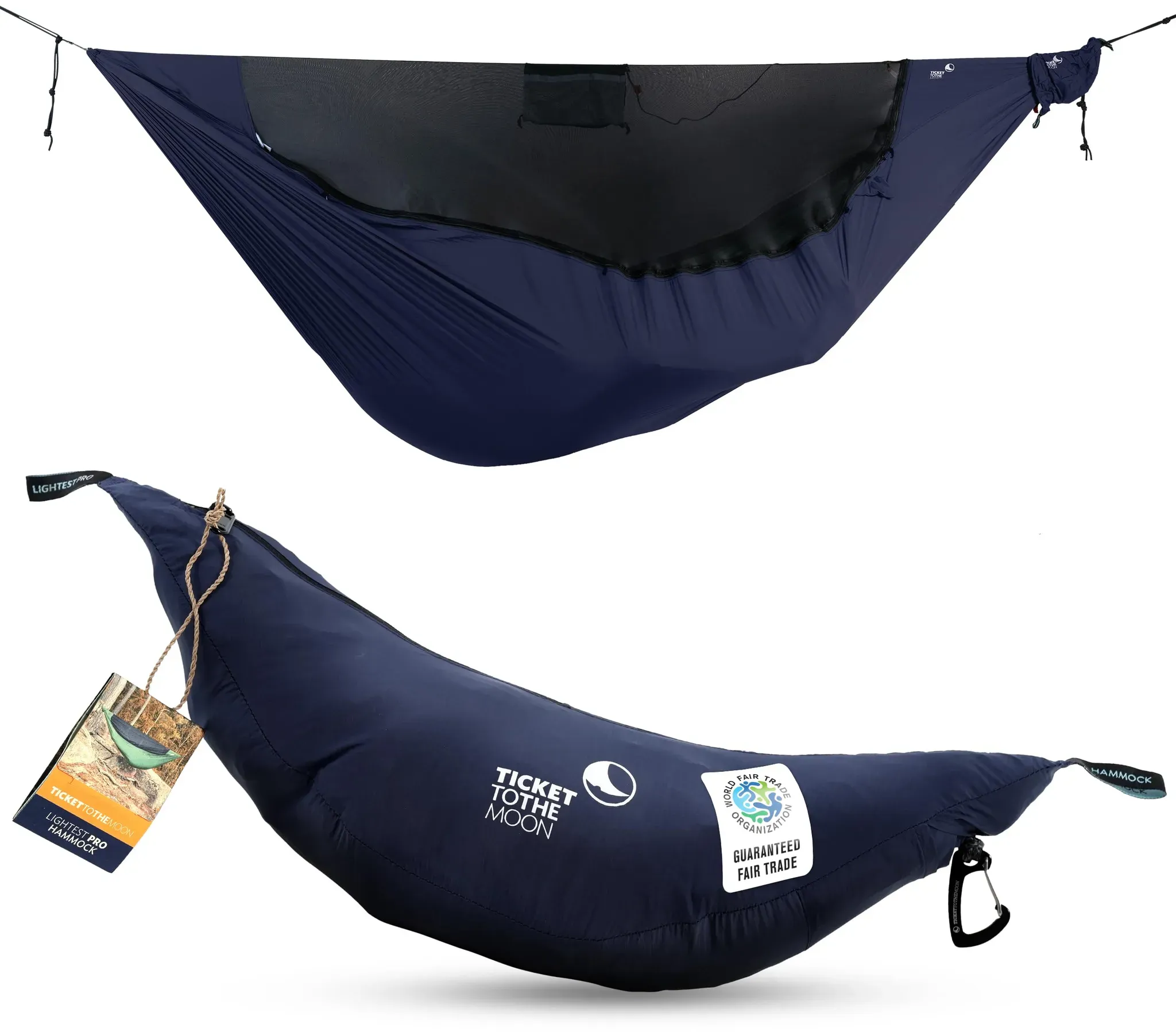 Ticket to the Moon - EAN: 0727670933680 - Entdecke die Lightest Pro Hammock 2024 von Ticket to the Moon dein perfekter Begleiter für Outdoor-Abenteuer. Diese hochwertige Fallschirmhängematte in elegantem Navy-Blau bietet dir ultimativen Komfort und Langlebigkeit. Egal ob beim Camping, Wandern oder einfach im eigenen Garten, die Lightest Pro Hammock ist vielseitig einsetzbar und sorgt für entspannte Momente in der Natur. Die Marke Ticket to the Moon steht für Qualität und Nachhaltigkeit, sodass du dich auf ein umweltfreundlich hergestelltes Produkt verlassen kannst. Erlebe unvergessliche Augenblicke und genieße die Freiheit, die dir diese außergewöhnliche Hängematte bietet. - bei jns.de - aus Yadore Produktdaten Diese ultraleichte Pro-Hängematte bietet mit integriertem Insektenschutz und Ridgeline hohen Komfort für anspruchsvolle Outdoor-Abenteuer. ![]() ![]() Ticket to the Moon Lightest PRO-Hängematte - Ultraleicht (590 g), Kompakt (325 cm x 140 cm) - inkl. Insektenschutz & integrierter Ridgeline - variierbare Länge (bis zu 3,1 m), Aufbewahrungssystem (Marineblau)