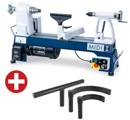 Verfügbarkeit: lieferbar, 3-5 Werktage - Kategorie: E-Bikes - drechselmeister - Die neue MIDI 3 Tischdrechselbank mit drehbarem Spindelstock vereint die bewährten Eigenschaften der MIDI Serie mit herausragenden neuen Funktionen in diesem Maschinensegment! Ausgestattet ist sie mit einem schwenkbaren Spindelstock mit 190 (!) mm Spitzenhöhe und extra stabilem Bankbett, SAFE-START-Funktion* und 2-stufigem Bremsschalter. Zusätzlich lässt sich die MIDI 3 aufgrund ihrer Bauweise für Linkshänder anpassen**. Das Bankbett wurde von der MIDI 2 Plus übernommen, somit ist eine breite Standfläche von 30 cm gewährleistet und die Drehbarkeit des Spindelstockes kann optimal genutzt werden ohne Einbußen bei der Stabilität. Die neue MIDI 3 ist aber mit einigen zusätzlichen Features ausgestattet! Die Highlights der neuen MIDI 3 auf einen Blick Drehbarer Spindelstock (eine Besonderheit in dieser Klasse!) Gussbankbett mit extra breiter Standauflage von 30 cm NEU! Frequenzumrichter mit SAFE-START Funktion verhindert einen versehentlichen Start mit zu hoher Drehzahl*. Die MIDI3 kann für Linkshänder umgebaut werden! (Dank zusätzlichem Riemen-Schaufenster, Spindelarretier-Bohrung und Pinolenskala auf der Rückseite, sowie entsprechend umbaubaren Maschinenteilen (Handauflagen-Unterteil und Reitstock-Klemmung). 2-stufiger Bremsschalter (schnell / standard), der die Bremsgeschwindigkeit der Spindel nach dem Ausschalten der Maschine regelt. (Kurze Bremszeit = ideal z.B. beim Drechseln ... ![]() ![]() Drechselmeister MIDI 2 PLUS Tischdrechselbank | Setaktion