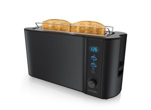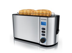 5 Händlerangebote bei billiger.de - Kategorie: Toaster - sommertal - RETRO VINTAGE DESIGN: Der Sommertal ST1500XXL Toaster fällt durch seine gebürstete Edelstahl Hülle und geschwungene Form auf. Dabei erinnert er an das kultige Retro Design der 70er Jahre.VIEL PLATZ: Der Langschlitztoaster bietet genügend Platz für 2 Scheiben Brot, sowie für bis zu 4 Scheiben Toast (American Sandwich). Dank des abnehmbaren Brötchenaufsatz, können Sie zusätzlich noch 2 Brötchen zeitgleich aufwärmen.1500W HEIZLEISTUNG: Mit starken 1500 Watt und seiner 360° QuickHeat-Technologie wird Ihr Toast gleichmäßig knusprig. Unterteilt in 7 Stufen (1,25min €“ 4,15min) findet jeder seinen Geschmack. Zusätzlich bietet das Gerät Ihnen eine Auftau-Funktion (Defrost) und Aufwärm-Funktion (Reheat).DIGITALDISPLAY MIT TIMER: über das Display wird Ihnen immer die genaue Restlaufzeit angezeigt. So wissen Sie immer, wann Ihr perfektes Toast fertig ist. Egal ob American (12x12cm), Standard (9x9cm) oder Mini (8x8cm). Einfache Reinigung dank der extra breiten Krümelschublade.TECHNISCHE DATEN: Abmessungen 18cmx18cmx40cm (HxBxL), Kabellänge 70cm, Anti-Rutsch Noppen, Gewicht 1,82Kg, Lift Funktion, Leistung 1500 Watt, Schlitzabmessung 26x12x3cm, beleuchtete Tasten. - GTIN:4250263781376 Ein moderner Toaster mit Touchscreen LED Display und 7 Bräunungsstufen, der ein gutes Benutzererlebnis bietet. ![]() ![]() Lebenlang Toaster 4 Scheiben mit Brötchenaufsatz - Touchscreen LED Display & 7 Stufen I 1400W 4er Langschlitztoaster Edelstahl Gebürstet I Smart Touch Toster für große Toastscheiben xxl