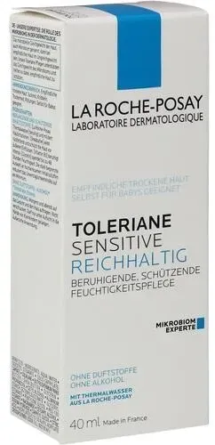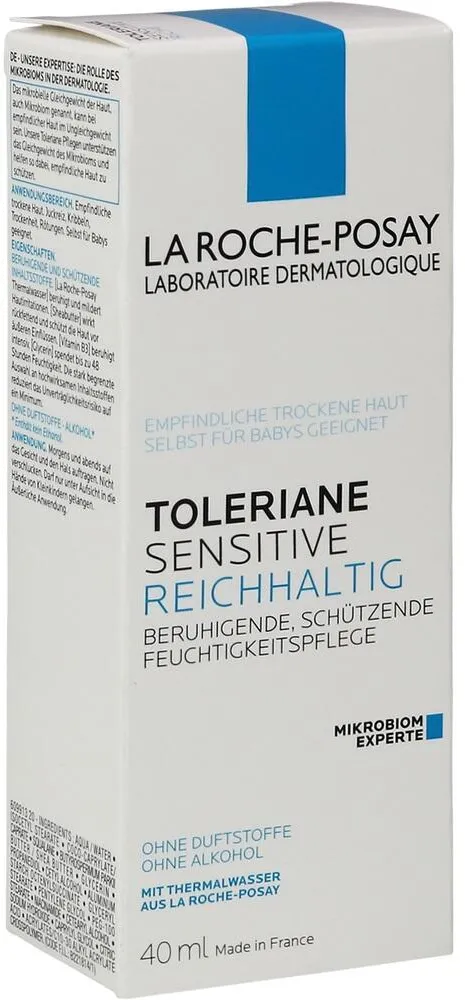 La Roche-Posay - EAN: 3337875675093 - Prebiotische Formel. Reguliert das Mikrobiom der Haut.Intensiv beruhigende Feuchtigkeitspflege. Stärkt die natürliche Widerstandskraft empfindlicher Haut.Bei empfindlicher Haut ist es wichtig, nicht nur die Hautschutzbarriere zu stärken, sondern auch das Mikrobiom, ihren unsichtbaren Schutzmantel, ins Gleichgewicht zu bringen.TOLERIANE SENSITIVE REICHHALTIG Prebiotische Formel Reguliert das Mikrobiom der Haut Spendet 48 Stunden Feuchtigkeit Schützt die Hautbarriere Pflegt intensiv Lindert und reduziert Hautirritationen Wirkt Spannungsgefühlen, Kribbeln, Trockenheit und Rötungen entgegen Speziell für leicht reizbare, empfindliche Haut.Toleriane Sensitive ist eine intensiv beruhigende Feuchtigkeitspflege mit prebiotischem Thermalwasser aus La Roche-Posay, die reizmildernd wirkt und die Haut bei Irritationen und Hitzegefühlen beruhigt. Die prebiotische Formel bringt das Mikrobiom ins Gleichgewicht und stärkt die natürliche Widerstandskraft empfindlicher Haut. Ein Minimum an hochwirksamen Inhaltsstoffen macht Toleriane besonders verträglich. Diese besonders hohe Verträglichkeit wurde unter dermatologischer Kontrolle getestet. Ohne Duftstoffe oder Alkohol. Sogar für Babys geeignet.Anwendung:Morgens und abends auf Gesicht und Hals auftragen. Mit einer reichhaltigen Konsistenz für besonders anspruchvolle, trockene und empfindliche Haut geeignet.Inhaltsstoffe: AQUA / WATER, ISOCETYL STEARATE, COCO-CAPRYLATE/CAPRATE, SQUALANE, BUTYROSPERMUM ... Claras-apotheke.de bietet die 40 ml Creme für 14,79 Euro an, was immer noch ein sehr gutes Preis-Leistungs-Verhältnis darstellt. ![]() claras- apotheke.d e La Roche Posay Toleriane Sensitive Reichhaltige Creme, 40 ml