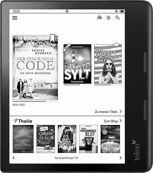 Kategorie: E-Book-Reader - Tolino - GTIN:4016621129347 - Großes 8-Zoll-Display: auch bei großer Schrift noch mehr Text auf einer Seite Blitzschnell durch neuen Quad Core-Prozessor und verbessertes E Ink Display Wasserschutz: entspannt lesen in der Badewanne, im Schwimmbad oder am See* smartLight: Anpassung der Beleuchtung je nach Tageszeit Automatische Display-Rotation: flexibel im Hoch- und Querformat lesen Für alle Lieblingsbücher: Speicherplatz für bis zu 24.000 eBooks tolino. Eine Marke des deutschen Buchhandels. *Schutz vor Süßwasser (bis 2 Meter Tiefe/60 Min.) Große Bühne für große Geschichten: der Highend-Reader mit 8-Zoll-Display Mit dem neuen tolino epos 3 erleben Sie das Maximum an Lesekomfort. Denn dank seines großformatigen 8 Zoll Displays passt noch mehr Text auf eine Seite, auch bei großen Schriften. Dadurch müssen Sie weniger umblättern und bleiben länger im Lesefluss, wenn die Geschichte gerade einmal wieder richtig spannend ist. Entscheiden Sie, wie Sie am liebsten Blättern: über das präzise Touchscreen oder die großen Blättertasten am Rand Ihres Geräts. Schneller Umblättern dank leistungsstärkerem Prozessor Mit dem tolino epos 3 blättern Sie aber nicht nur weniger, sondern auch deutlich schneller um. Denn das optimierte E Ink Display sorgt zusammen mit dem neuen, noch leistungsstärkeren Prozessor für eine 20 % kürzere Reaktionszeit gegenüber seinem Vorgängermodell. Das macht den Seitenwechsel deutlich angenehmer und ermöglicht Ihnen einen neuen, bislang ... Office Partner GmbH bietet den Tolino Epos 3 mit 32 GB in Schwarz zu einem soliden Preis an. ![]() ![]()