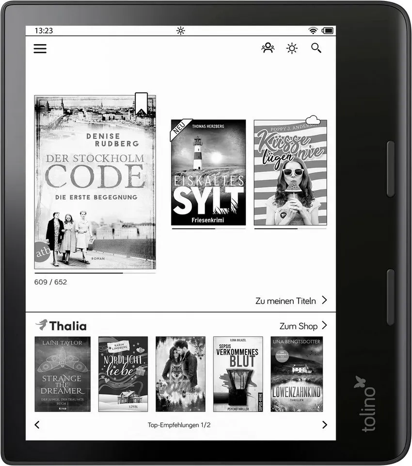 Kategorie: E-Book-Reader - Tolino - GTIN:4016621129347 - Großes 8-Zoll-Display: auch bei großer Schrift noch mehr Text auf einer Seite Blitzschnell durch neuen Quad Core-Prozessor und verbessertes E Ink Display Wasserschutz: entspannt lesen in der Badewanne, im Schwimmbad oder am See* smartLight: Anpassung der Beleuchtung je nach Tageszeit Automatische Display-Rotation: flexibel im Hoch- und Querformat lesen Für alle Lieblingsbücher: Speicherplatz für bis zu 24.000 eBooks tolino. Eine Marke des deutschen Buchhandels. *Schutz vor Süßwasser (bis 2 Meter Tiefe/60 Min.) Große Bühne für große Geschichten: der Highend-Reader mit 8-Zoll-Display Mit dem neuen tolino epos 3 erleben Sie das Maximum an Lesekomfort. Denn dank seines großformatigen 8 Zoll Displays passt noch mehr Text auf eine Seite, auch bei großen Schriften. Dadurch müssen Sie weniger umblättern und bleiben länger im Lesefluss, wenn die Geschichte gerade einmal wieder richtig spannend ist. Entscheiden Sie, wie Sie am liebsten Blättern: über das präzise Touchscreen oder die großen Blättertasten am Rand Ihres Geräts. Schneller Umblättern dank leistungsstärkerem Prozessor Mit dem tolino epos 3 blättern Sie aber nicht nur weniger, sondern auch deutlich schneller um. Denn das optimierte E Ink Display sorgt zusammen mit dem neuen, noch leistungsstärkeren Prozessor für eine 20 % kürzere Reaktionszeit gegenüber seinem Vorgängermodell. Das macht den Seitenwechsel deutlich angenehmer und ermöglicht Ihnen einen neuen, bislang ... Dieses Angebot von Galaxus.de ist ein Standardmodell des Tolino Epos 3 mit 32 GB Speicher in Schwarz zu einem wettbewerbsfähigen Preis. ![]() ![]()