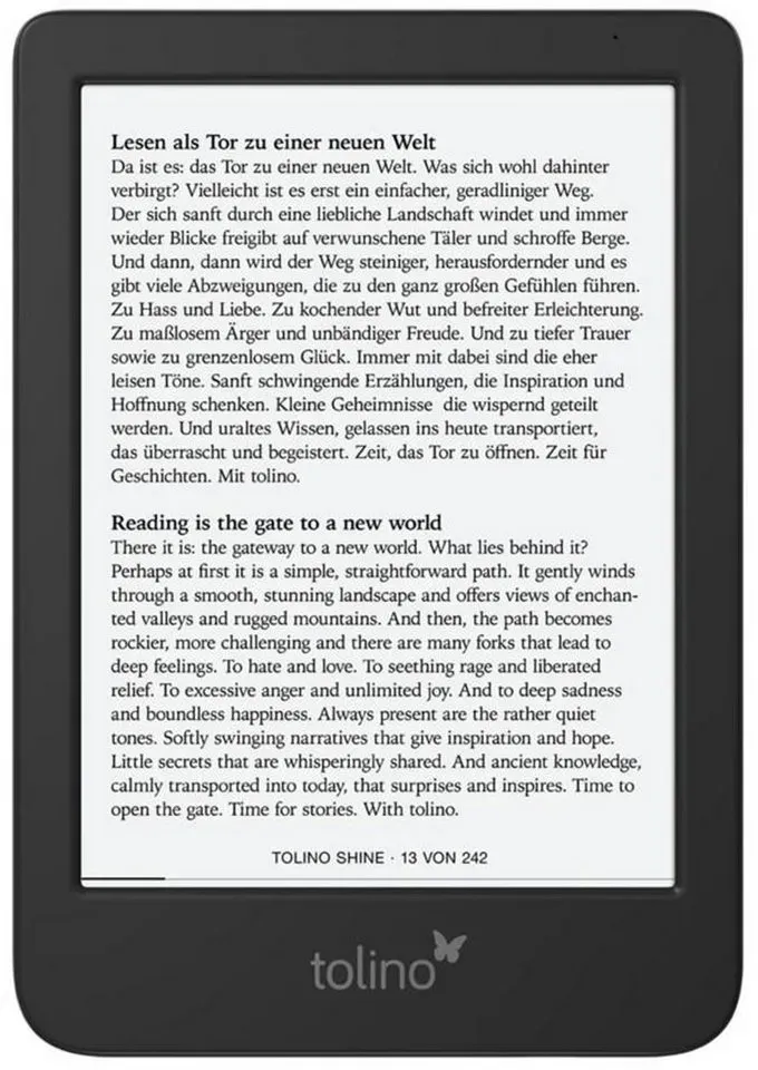 Gesamtsortiment IT + Multimedia Smartphones + Tablets Tablet + eReader eReader Laptops, Tablet-PCs & eBooks - EAN:4016621130473 - Erlebe mit dem tolino shine color eine völlig neue Dimension des Lesens! Mit seinem innovativen 6 Zoll E Ink Kaleido 3 Display bietet dieses Gerät eine Auflösung von 1448 x 1072 Pixel und 300 ppi für Schwarz-Weiss-Inhalte sowie 150 ppi für Farbinhalte. Tauche ein in die Welt der Bücher und geniesse gestochen scharfe Texte und lebendige Bilder. Der kapazitive Touchscreen ermöglicht eine einfache Bedienung mit Multi-Touch-Funktionen wie Tippen, Scrollen oder Zoomen. Mit seinen kompakten Abmessungen von 112 x 160 x 9,1 mm und einem Gewicht von nur 173 g liegt der tolino shine color angenehm in der Hand. Dank der integrierten smartLight Beleuchtung passt sich die Farbtemperatur automatisch an die Tageszeit an, während das IPX8 Coating das Gerät vor Wasser schützt - perfekt für entspannte Leseabende im Bad oder am Strand. Der leistungsstarke Lithium-Polymer-Akku mit einer Kapazität von 1.500 mAh sorgt für wochenlange Akkulaufzeit, damit du stundenlang in deine Lieblingsgeschichten eintauchen kannst. Mit einem internen Speicher von 16 GB bietet der tolino shine color Platz für bis zu 12.000 eBooks oder 75 Hörbücher, ergänzt durch zusätzliche Cloud-Speicheroptionen. Dank Wi-Fi ac/b/g/n und Bluetooth 5.0 bist du immer bestens vernetzt und kannst auch unterwegs auf deine Bibliothek zugreifen. Der tolino shine color unterstützt eine Vielzahl von ... Dieses Angebot von ejoker.de ist eine weitere Option für den Tolino Shine 5. ![]() ![]() Tolino shine (5. Generation)
