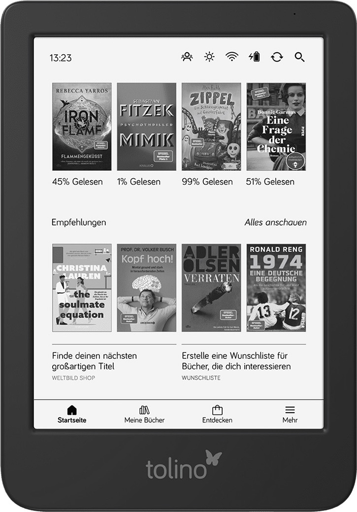 Tolino - EAN: 4016621130466 - Blendfreies, gestochen scharfes Schwarz-Weiß-Display / NEU: Hörbücher genießen via Bluetooth / Wasserschutz für sorgenfreies Lesen am Pool oder Badewanne / Wochenlange Akkulaufzeit / smartLight: Anpassung der Beleuchtung a - bei notebooksbilliger.de - aus Yadore Produktdaten Dieses Angebot von computeruniverse.net ist eine solide Option für den Tolino Shine 5. ![]() Thalia tolino shine 5. Generation eBook-Reader; 6'-E-Ink-Display