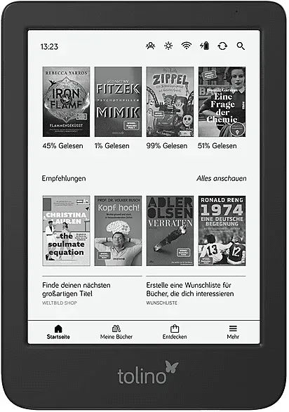 15 Händlerangebote bei billiger.de - Kategorie: E-Book-Reader - Tolino - Blendfreies, gestochen scharfes Display: kontrastreiches und hochauflösendes E Ink Schwarz-Weiß-Display NEU: Hörbuch-Wiedergabe: Hörbücher genießen via Bluetooth-Kopfhörer oder -Lautsprecher Lesen bei allen Lichtverhältnissen: mit smartLight Beleuchtung anpassen 16 GB interner Speicher: Platz für bis zu 12.000 eBooks oder 75 Hörbücher [1] Wasserschutz [2] : sorgenfreies Lesen in der Badewanne oder am Pool Wochenlange Akkulaufzeit [3] : stundenlanges Lesen ohne häufiges Aufladen Entspannte Lesestunden dank augenschonendem Display Der tolino shine überzeugt mit einem 6 Zoll Bildschirm, der für angenehmes und entspanntes Lesen sorgt. Mit hochauflösendem Schwarz-Weiß-Touchscreen und E-Ink-Carta Technologie fühlt sich das Lesen fast wie auf einer gedruckten Buchseite an. Stundenlanges Lesevergnügen, ohne Augenermüdung, und der blendfreie Bildschirm ermöglicht sogar das Lesen im Freien bei hellem Sonnenlicht. Entdecken Sie das tolino shine Display und überzeugen Sie sich selbst, wie digitales Lesen zu einem wahren Genuss wird. Ohren auf: jetzt mit Hörbuchwiedergabe via Bluetooth Jetzt können Sie Ihre Lieblingsgeschichten nicht nur lesen, sondern auch hören €“ genießen Sie Ihre Wunschtitel als Hörbuch mit der kabellosen Wiedergabe via Bluetooth über Kopfhörer oder Lautsprecher. Perfekt für alle Alltagssituationen, in denen Sie keine Hände frei haben, bietet der tolino shine ein ... Der Tolino Shine 5th Gen. bei Mediamarkt ist eine gute Wahl für ein aktuelles Modell mit 16 GB Speicher. ![]() TOLINO Shine 5th Gen 16 GB eReader Schwarz