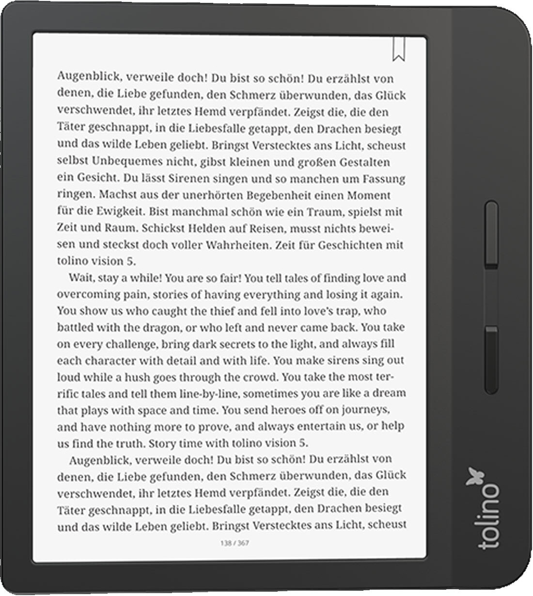 EAN: 4016621128326 - Der 7-Zoll-eReader mit ergonomischer Form für intuitive Bedienung Jetzt noch mehr Lesevergnügen auf dem vergrößerten 7-Zoll-Display! Der tolino vision 5 bietet mehr Platz für Ihre Geschichten, auch bei großen Schriftgrößen. Entscheiden Sie, wie Sie am liebsten umblättern: über den präzisen und schnellen Touchscreen oder die großen Blättertasten am Rand Ihres tolino vision 5. Durch die ergonomisch optimierte Form mit Blättertasten, griffiger Rückseite und Soft-Touch-Oberfläche liegt Ihr vision 5 immer bestens in der Hand. Flexibel sind Sie auch durch die automatische Display-Anpassung, die es Ihnen erlaubt, jederzeit zwischen Hoch- und Querformat zu wechseln. Noch mehr Komfort und Flexibilität für Ihre perfekte Leseauszeit! smartLight: Lesen im Einklang mit Ihrem Tag Für alle, die gern vor dem Einschlafen lesen, haben wir smartLight entwickelt! Denn der neue Komfort-eReader tolino vision 5 sorgt mit seiner cleveren Anpassung der Farbtemperatur des integrierten Leselic Tolino Vision 5 - eBook-Reader - 17.8 cm (7') einfarbig E Ink Carta - Touchscreen - Wi-Fi - bei kaufland.de - aus Yadore Produktdaten Sie erhalten mehr Ergebnisse, aktuelle Angebote und weitere Preisbereiche wenn Sie den Preisvergleich aktualisieren: Mehr tolino vision 5 Angebote Jetzt live Meta-Preisvergleich starten! Tolino vision 5 Testberichte