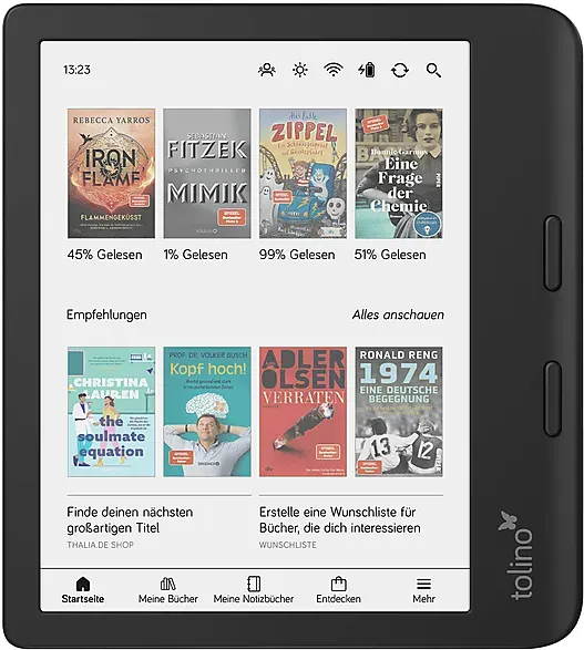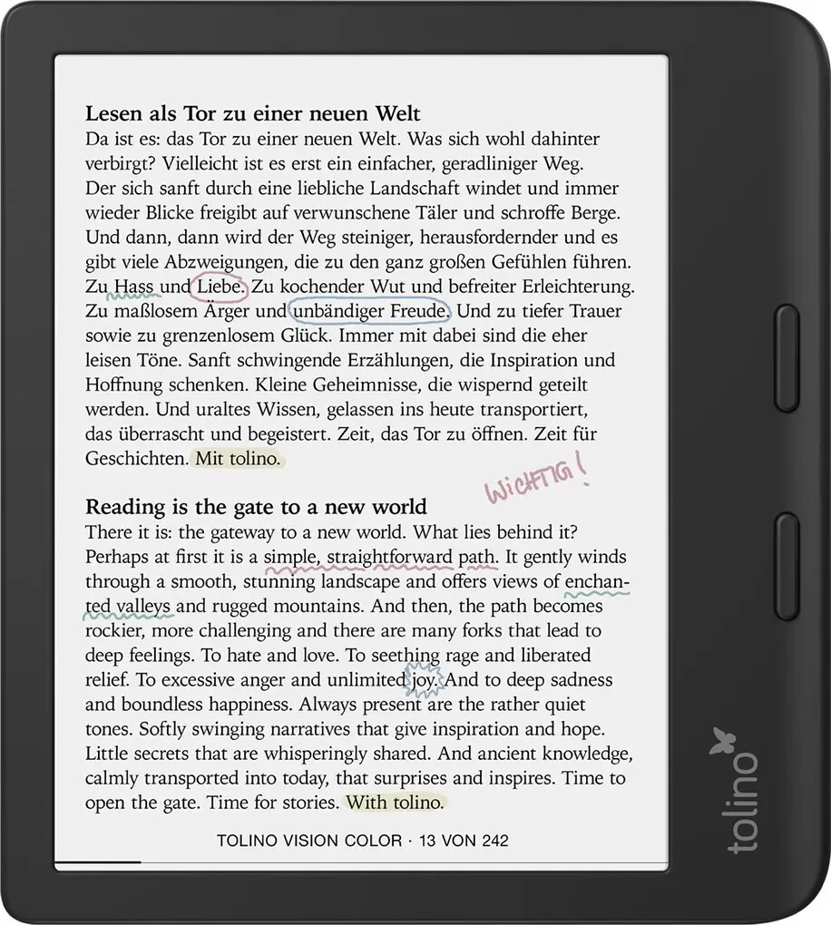 Kategorie: E-Book-Reader - Tolino - GTIN:4016621130183 - NEU: 7 Zoll Farbdisplay: 4.096 Farben für lebendige Inhalte NEU: Alles Wichtige festhalten: notieren, markieren und gestalten mit dem neuen tolino stylus NEU: Hörbuch-Wiedergabe: Hörbücher genießen via Bluetooth-Kopfhörer oder -Lautsprecher Praktische Blättertasten: für noch bequemeres Vor- und Zurückblättern Automatische Display-Rotation: flexibles Lesen im Hoch- und Querformat, egal ob Links- oder Rechtshänder Lesen bei allen Lichtverhältnissen: mit smartLight Beleuchtung anpassen 32 GB interner Speicher: Platz für bis zu 24.000 eBooks oder 150 Hörbücher [1] Wasserschutz [2] : sorgenfreies Lesen in der Badewanne oder am Pool Wochenlange Akkulaufzeit [3] : stundenlanges Lesen ohne häufiges Aufladen Jetzt wird s bunt Erleben Sie Ihre Lieblingsgeschichten jetzt auch in Farbe. Egal ob einzigartiges Buchcover, illustriertes Kinderbuch, appetitliche Rezeptideen oder atemberaubende Urlaubsziele, mit dem neuen Farbdisplay und bis zu 4.096 darstellbaren Farben erweckt der tolino vision color Ihre Lieblingsinhalte erstmals in Farbe auf völlig neue Art zum Leben. Ihr Lieblingstitel besteht rein aus Text? Kein Problem! Das neue Display liefert natürlich auch weiterhin Schwarz-Weiß- Inhalte kontrastreich und hochauflösend. Halten Sie Notizen, Ideen u. v. m. festoder highlighten Sie wichtige Textpassagen Der tolino vision color ist unser erster eReader, der auch ein Notizbuch ist. Verwenden Sie den separat erhältlichen tolino ... Media Markt bietet den Tolino Vision Color zu einem guten Preis an, was ihn für Kunden attraktiv macht, die bei einem großen Elektronikhändler einkaufen. ![]() ![]() TOLINO Vision Color 32 GB eReader Schwarz