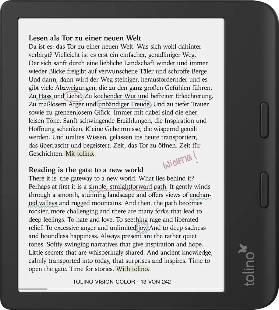 16 Händlerangebote bei billiger.de - Kategorie: E-Book-Reader - Tolino - Neu: 7 Zoll Farbdisplay: 4.096 Farben für lebendige Inhalte. Neu: Alles Wichtige festhalten: notieren, markieren und gestalten mit dem neuen tolino stylus. Neu: Hörbuch-Wiedergabe: über den tolino gekaufte oder im Hörbuch-Abo erworbene Hörbücher via Bluetooth-Kopfhörer oder -Lautsprecher genießen. Praktische Blättertasten: für noch bequemeres Vor- und Zurückblättern. Automatische Display-Rotation: flexibles Lesen im Hoch- und Querformat, egal ob Links- oder Rechtshänder. Lesen bei allen Lichtverhältnissen: mit smartLight Beleuchtung anpassen. 32 GB interner Speicher: Platz für bis zu 24.000 eBooks oder 150 Hörbücher. Wasserschutz: sorgenfreies Lesen in der Badewanne oder am Pool. Wochenlange Akkulaufzeit: stundenlanges Lesen ohne häufiges Aufladen, - GTIN:4016621130183 Mit 169 Euro bei eBook.de ist dies ein weiteres sehr preiswertes Angebot für den Tolino Vision Color. ![]() ![]() tolino vision color