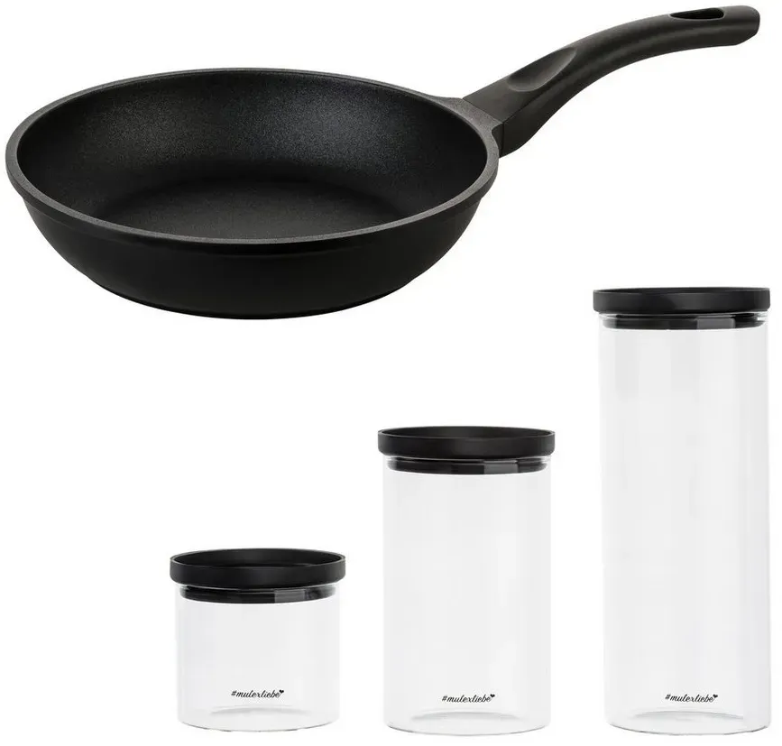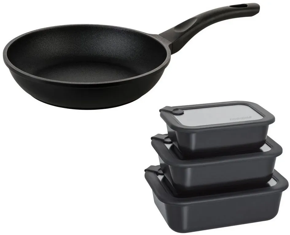 lieferbar-in 4-5 Werktagen bei dirMulex Bratpfanne TOMALIN Premium 26 cm inklusive LUND Meal Cubes aus gehärtetem Glas, Pfanne Aluguß (Premium Qualität // 7tlg., 7-tlg., Tomalinbeschichtung // Meal Cube aus gehärtetem Glas), induktionsgeeignet schwarz