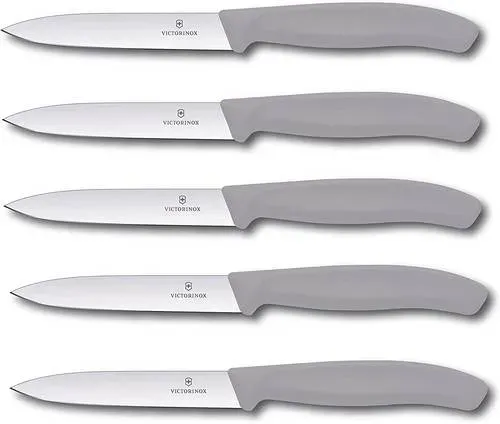 Kategorie: Küchenmesser - Victorinox - GTIN:4260408198235 - Victorinox Swiss Classic Schälmesser 5er Set mit extra scharfem Schliff. Klingenlänge : 10 cm Trendige Farben und spülmaschinengeeignet Mit seinem extra scharfen Wellenschliff und dem zulaufenden Mittelspitz stellt das Swiss Classic Gemüsemesser alle anderen Messer in Ihrer Schublade in den Schatten Damit schneiden Sie mühelos durch dicke Schalen. Das Entfernen von Kernen und Kerngehäusen war nie einfacher. Dieses Messer ist alles, was Sie brauchen, um all Ihr Gemüse in Nullkommanichts in eine köstliche, nahrhafte Mahlzeit zu verwandeln. - 26,50 Euro bei Amazon Marketplace Home - gefunden von billiger.de Dieses 5er Set Gemüsemesser in Cool Grey für 29,90 Euro ist eine stilvolle und funktionale Ergänzung für jede Küche. ![]() ![]() Victorinox | 5er Set Gemüsemesser Tomatenmesser | Swiss Classic 10 cm | Cool Grey | perfekt für präzises Schneiden & Schälen | langlebige Qualitä