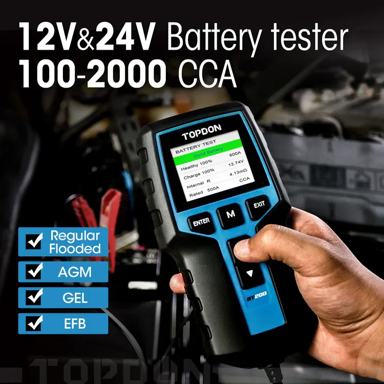Auf Lager Versand durch AmazonTOPDON Autobatterie Tester BT200, 12V 24V batterietester kfz 100-2000 CCA, batterie tester auto Lade-Anlasser-System Autoatterie analysator für LKW Schiff SUV Boot