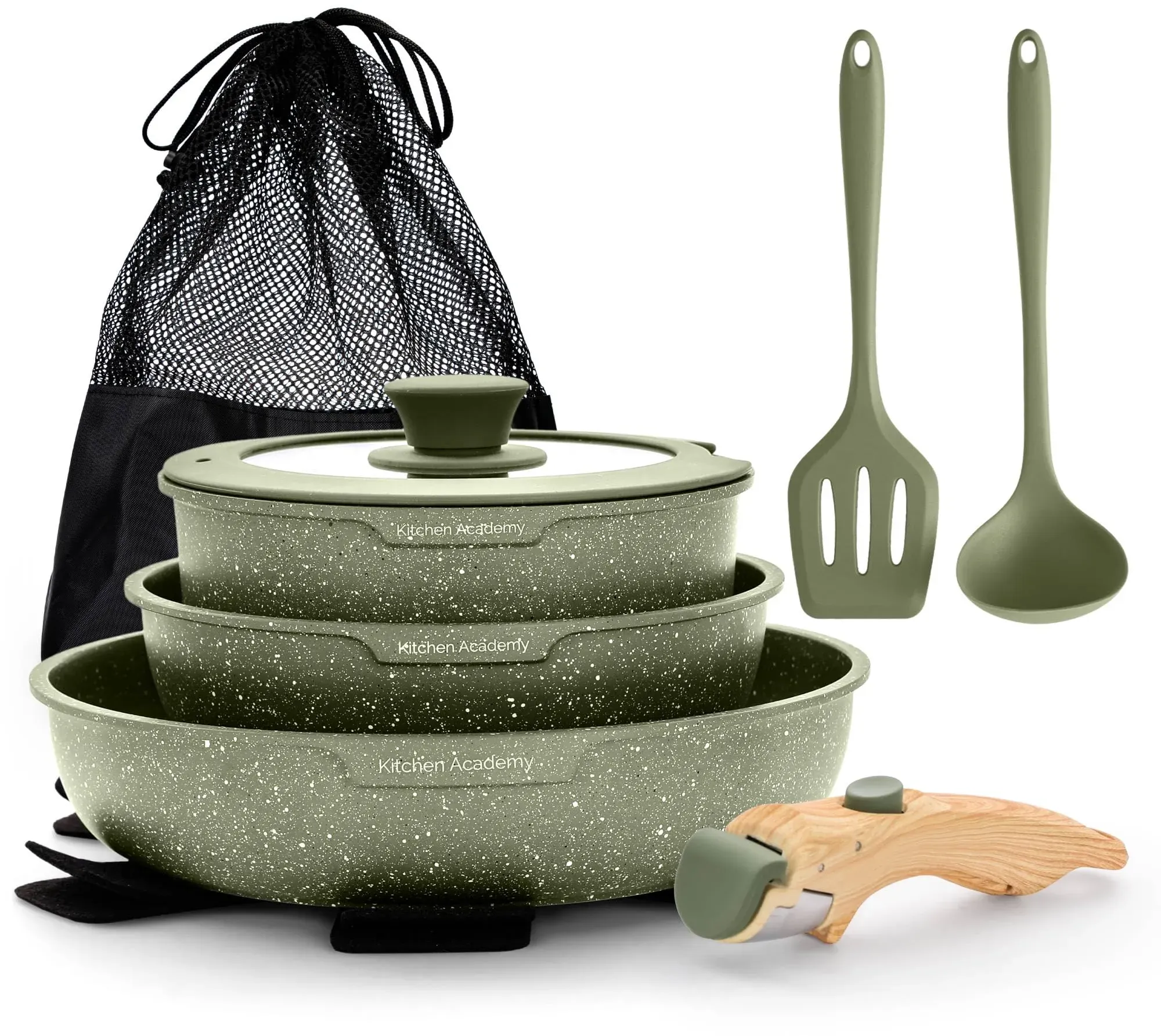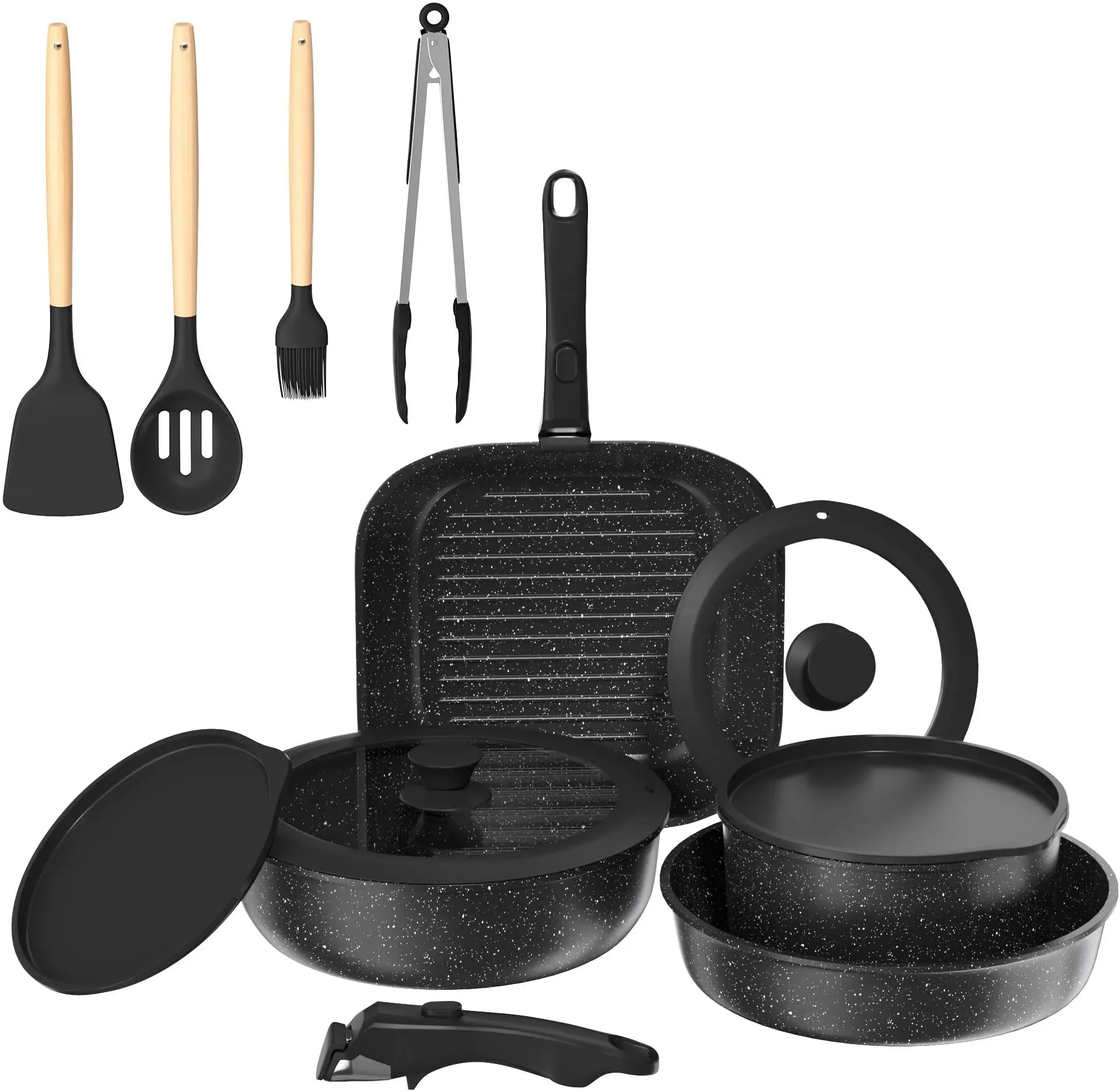 Verfügbarkeit: Auf Lager - Kategorie: Töpfe - Joyfair - Hochwertiger Edelstahl: Joyfair Topfset ist aus professionellem Edelstahl gefertigt, erhindert effektiv Verformungen und Rostbildung und ist dadurch robuster und langlebiger als gewöhnliche Töpfe, Es ist frei von schädlichen Chemikalien und bewahrt den echten Geschmack der Zutaten für eine gesunde Küche, wodurch das tägliche Kochen mühelos wird Abnehmbarer Griff: Der Griff ist mit einem Sicherheitsverschlussmechanismus ausgestattet, der während des Kochens einen stabilen und zuverlässigen Halt bietet, Nach dem Abnehmen des Griffs mit einem Klick lassen sich alle Töpfe platzsparend stapeln, wodurch bis zu 70 % Stauraum eingespart werden, So lassen sie sich bequemer transportieren und können problemlos in Schränken oder Wohnmobilen verstaut werden( Empfehlung: Entfernen Sie beim Kochen bitte den Griff, um zu verhindern, dass übermäßige Hitze seine Haltbarkeit beeinträchtigt. Außerdem passt der Deckel ohne Griff sicher auf den Topf) Schnell & Gleichmäßig Erhitzen: Klassisches Dreifachboden-Design (18/10 Edelstahl für die innere Schicht, Hochwertiger Aluminiumkern und magnetischer Edelstahl für die äußere Schicht) hat eine gute Wärmeleitfähigkeit, Schnelle und gleichmäßige Erwärmung, Besser zum Energiesparen, Geeignet für alle Herde, Einschließlich Induktion, Gas, Keramik, Elektro, Halogen usw Macht das Reinigen zum Kinderspiel: Die glatte Oberfläche reduziert das Risiko, Dass Lebensmittel ... Das AUROAY Pfannenset ist mit 14 Teilen und 2 abnehmbaren Griffen sehr umfangreich und für alle Herdarten sowie den Ofen geeignet. ![]() ![]() AUROAY Pfannenset 14-teiliges Antihaft-Kochgeschirr-Topfsets Kochtopf Set mit 2 abnehmbaren Griffen, Schmortopf, Grillpfanne 4 Deckel Stapelbar Pfannen PFOA-frei, geeignet für alle Herdarten Ofenfest