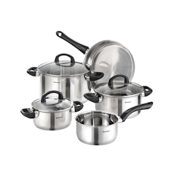 Der angezeigte Preis könnte seit dem letzten Update gestiegen sein - EAN: 3176239944334 - BESCHREIBUNG: Fackelmann Geneva 18/8 Edelstahl Topfset, 12 cm, 16 cm und 20 cm, perfekt für Saucen und verschiedene Gerichte für 1 bis 4 Personen KLEINES +: Ergonomischer Bakelit-Griff, integrierte Messskala für präzise Rezepte und Ausgießer... - Zustand: NEW - bei Metro.de - gefunden von Buycentral Dieses 5-teilige Set bietet eine gute Grundausstattung für den Haushalt zu einem attraktiven Preis. ![]() Kärcher Karcher Topfset Mia aus Edelstahl, Induktion, Töpfe mit Glasdeckel / Pfanne / Stielkasserolle, 5-teilig