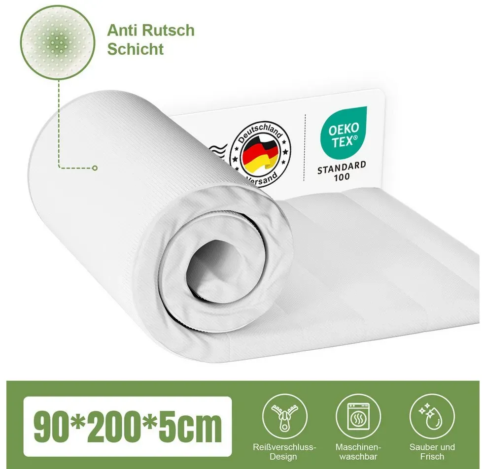 Zustand: Neu - Matratzentopper - Vesgantti - VXT-001 - EAN: 0840452625037 - Doppelschichtiges & Belüftetes Design. Dieser 10 cm Matratzentopper verfügt über ein 2 Schichten Design, das aus 5 cm Gel Memory Schaum und 5 cm Schaum mit hoher Dichte besteht. Der kühlende Gelschaum hilft, Überhitzung zu vermeiden und eine kühlere Temperatur als gewöhnlicher Memory Schaum aufrechtzuerhalten; Die hochdichte Stützschaumschicht an der Basis bietet eine solide Grundlage mit starker Körperunterstützung für eine gleichbleibende Schlafqualität. Der gesamte Topper 90x200 cm ist mit einem atmungsaktiven, offenporigen Belüftungsdesign gefertigt. Hervorragender Halt & Komfort. Der hochdichte Memory Schaum passt sich Ihren Körperkonturen an und verteilt das Gewicht gleichmäßig, um die Wirbelsäule auszurichten und Druckpunkte zu entlasten. Er sorgt für eine ideale Luftzirkulation und hilft, die Bewegungsübertragung zu eliminieren, sodass Sie leicht einschlafen und die ganze Nacht durchschlafen können. Rutschfester & Waschbarer Bezug. Der atmungsaktive Bezug besteht aus hautfreundlichem Strickgewebe, das seidenweiche Geschmeidigkeit mit außergewöhnlicher Atmungsaktivität kombiniert. Der leicht abnehmbare Bezug ist maschinenwaschbar, wodurch Sie ihn sauber halten und die Lebensdauer des Matratzentoppers verlängern können. Das erspart Ihnen die häufige Entsorgung des Gel Toppers und vermeidet somit unnötigen Abfall. Zudem verfügt er über vier elastische Eckgurte, die ein Verrutschen des ... Der sleepling orthopädische Viscoschaum Topper ist mit 69.99 Euro eine empfehlenswerte Wahl für alle Matratzen mit Memory Foam Effekt. ![]() ![]() sleepling orthopädischer Viscoschaum Topper, 90 x 200 cm, für alle Matratzen, Memory Foam Effekt, liebling