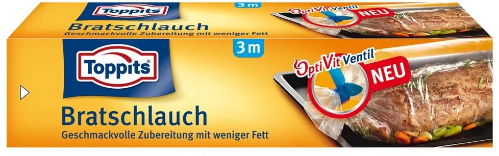 1.56 / Meter - Kategorie: Sonstiges Backzubehör - Toppits - GTIN:4008871209672 - Lecker-leichte Küche mit weniger Fett: Bratschlauch für geschmackvolle Zubereitung von Lebensmitteln im Backofen ohne Fettzugabe Von Fleisch über Fisch bis zu Geflügel: Individuell zuschneidbar auf die gewünschte Länge Optimales, schonendes Dampfgaren: Regulierung heißer Luft durch OptiVit Ventil, Erhalten natürlicher Aromastoffe, Vitamine und Nährstoffe Sauberer Ofen durch geschlossenes Garsystem Lieferumfang: 1 Packung Toppits Bratschlauch, 3 Stück, Maße: 174 x 38 x 65 mm (B x T x H), Gewicht: 55 g, Farbe: Transparent - 4,67 Euro bei Amazon Marketplace Health & Personal Care - gefunden von billiger.de ![]() ![]() sufe Toppits Bratenschlauch (31 cm x 3 m), 2er Pack (2 x 3 m), PVC-frei, Polypropylen (PP), Rostbeutel, Food Wrap