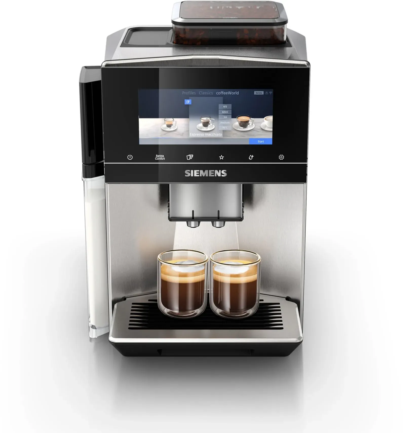 Siemens - EAN: 4242003896853 - ARTIKELBESCHREIBUNG Siemens TQ905D03, KaffeevollautomatHighlights - Das intuitive Full-Touch Display bietet dir Kontrolle über jede Kaffeenuance - ganz wie ein Barista. Passt alle Getränkeeinstellungen perfekt an die Kaffeebohnen an. - beanIdent System: hole das Optimum aus deiner Röstungen heraus, dank perfekter Einstellungen des Brühvorgangs - Tassenwärmer: längerer Genuss und besseres Aroma durch vorgewärmte Tassen - EQ900 Profile: speichere bis zu 10 personalisierte Profile - Siemens Design: dynamisch elegant und aus hochwertigem Material - autoMilk Clean: automatische Dampfreinigung des Milchsystems nach jeder Getränkezubereitung Geschmack beanIdent System - passt alle Getränkeeinstellungen an die Kaffeebohnen an baristaMode - volle Kontrolle über alle relevanten Brühparameter Bis zu 33 verschiedene Spezialitäten (inkl. Milch, Milchschaum und Heißwasser) im Gerät und der Home Connect App Bezug von warmer Milch, Milchschaum und heißem Wasser Milchanteil für klassische Milchmischgetränke anpassbar aromaBoost - mehr Aroma für Espresso-basierte Getränke durch einen feineren Mahlgrad Intelligente Aromaanpassung - Kaffeemanagement basierend auf Stärke und Getränkegröße Aroma Select - 3 verschiedene Aroma-Profile (mild-ausgewogen-markant) Brita Intenza Wasserfilter enthalten Komfort iSelect Display - farbiges 6,8'' TFT-Display mit Touch & Slide Funktion eGrinder - Anpassung des Mahlgrades für jedes einzelne Getränk über das Display ... ![]() kaufland.d e Siemens TQ905D03, Espressomaschine, 2,3 l, Kaffeebohnen, Eingebautes Mahlwerk, 1500 W, Edelstahl