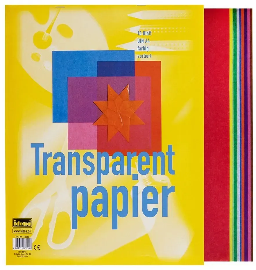 Kategorie: Basteln - IDENA - GTIN:4002372005207 - Eigenschaften Material , Papier, Maße & Gewicht Format , DIN A4, Farbe Farbe , bunt, Hinweise Warnhinweise , Keine Warnhinweise vorhanden, - 2,49 Euro bei OTTO - gefunden von billiger.de Dieses weiße Transparentpapier von folia ist ein vielseitiges Produkt für verschiedene kreative Anwendungen. ![]() ![]()