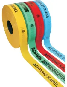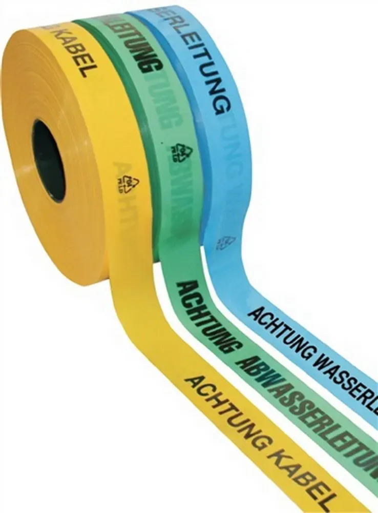 Das Band trägt entsprechende Aufdrucke wie 'Achtung Kabel", 'Achtung Gasleitung" oder 'Achtung Wasserleitung".[7] Materialqualität und Eigenschaften Das Trassenwarnband sollte folgende Eigenschaften erfüllen:[3][7]