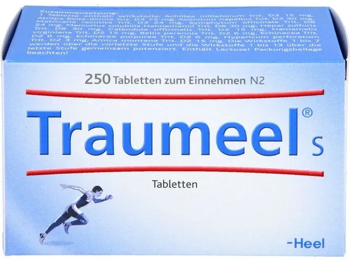 0,16 /St - Kategorie: Arzneimittel - Heel - GTIN:4047642008502 - PZN:03515294 - Traumeel S TablettenTraumeel S ist ein Arzneimittel mit 14 natürlichen Inhaltsstoffen. Die optimal aufeinander abgestimmten Wirkstoffe wie Arnika, Calendula, Hamamelis und Beinwell ergänzen sich in ihrer Wirkung bei akuten Beschwerden.Dosierung und Art der AnwendungSoweit nicht anders verordnet, können Erwachsene und Kinder ab 1 n 3x täglich je eine Tablette im Mund zergehen lassen.Traumeel S Tabletten sind auch für den Einsatz bei Kindern ab dem ersten Lebensjahr geeignet. Kinder unter n kann 1-3x täglich je eine halbe Tablette verabreicht werden. Kinder von 6 bis 1 n können täglich 2/3 der Erwachsenen-Dosis einnehmen.Traumeel S Tabletten sind gut verträglich. Sie sollten ohne ärztlichen Rat jedoch nicht länger als 8 Wochen eingenommen werden.PflichttextTraumeel S Tabletten Reg.-Nr.: 2522108.00.00Anw.geb.: Reg. homöopath. Arzneim., daher ohne Angabe einer therap. Indikation. Warnhinweise: Enth. Lactose. Packungsbeilage beachten. 1 Tabl. = 0,025 BE.Zu Risiken und Nebenwirkungen lesen Sie die Packungsbeilage und fragen Sie Ihre ärztin, Ihren Arzt oder in Ihrer Apotheke.Biologische Heilmittel Heel GmbH, Dr.-Reckeweg-Straße 2-4, 76532 Baden-Baden - 40,75 Euro bei medpex.de - gefunden von billiger.de ![]() ![]() Heel Traumeel S Tabletten 250 St