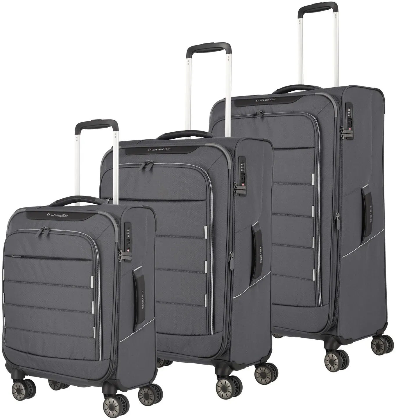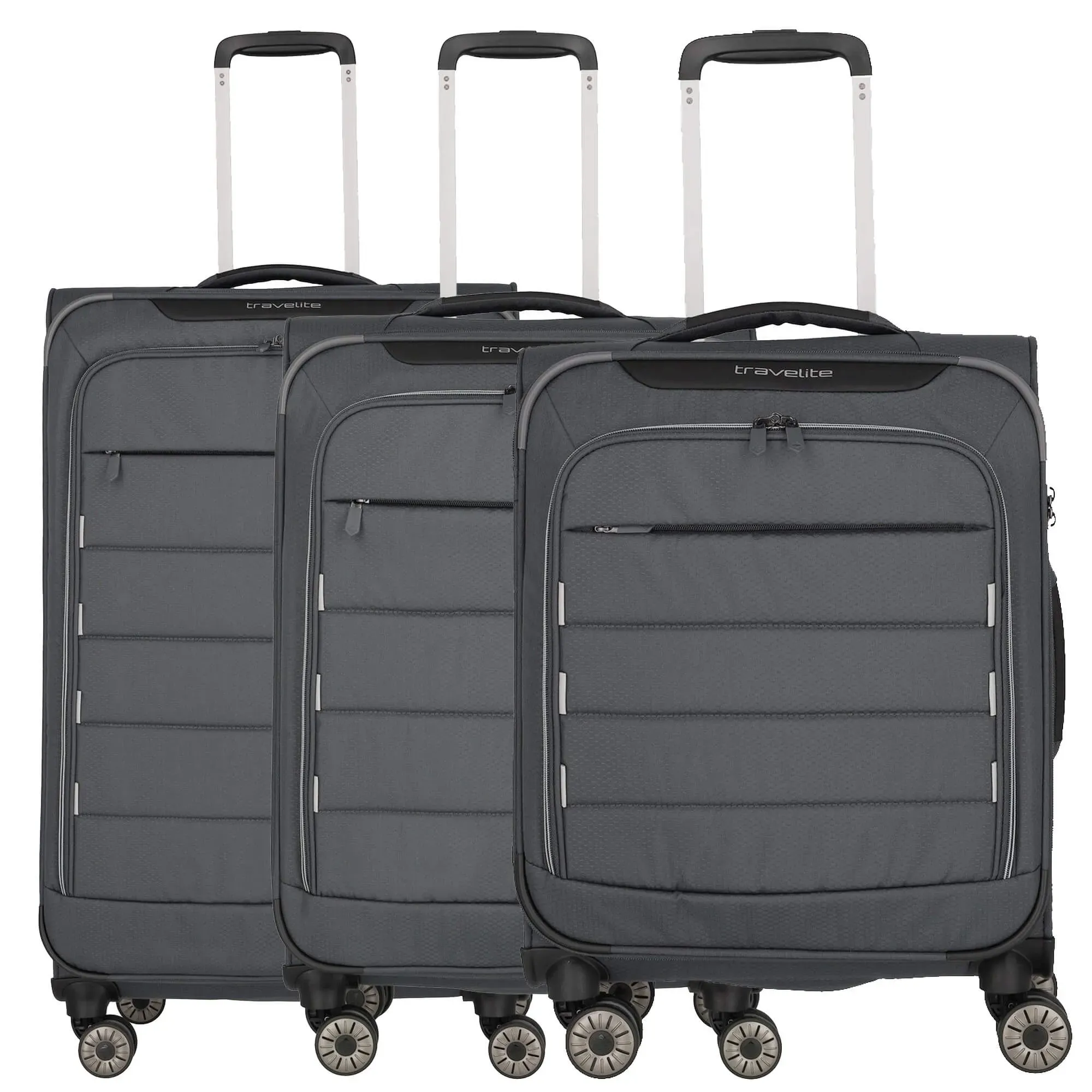 7 Händlerangebote bei billiger.de - Kategorie: Koffer-Sets - Travelite - Drei echte Leichtgewichte: die Skaii Trolley L, M und S im Set. Unglaublich leicht und dabei beruhigend robust - ein Traum. Hinzu kommt, dass alle Produkte aus recyceltem Polyester hergestellt werden und über ein integriertes TSA LOCK® Kombinationsschloss verfügen. Sind Sie bereit für eine sorgenfreie Zeit?Hergestellt aus recyceltem Polyester:- Das Obermaterial und das Innenfutter bestehen aus recyceltem Polyestergewebe, das aus zertifizierten recycelten Kunststoffabfällen gesponnen und anschließend verwebt wird. Eine nachhaltige Lösung, da so kein neues Plastik in den Kreislauf gelangt.Mehr Platz, wenn Sie ihn brauchen:- Die Skaii Trolleys in den Größen M und L bieten durch die praktische Dehnfalte ein erweiterbares Volumen. So lässt sich das Packvolumen mit einem Reißverschluss um weitere 5 bzw. 7 Liter erhöhen. Eigenschaften:- Besonders leicht - Obermaterial sowie Innenstoff aus recyceltem Material mit GRS-Zertifikat - Dehnfalte zur Volumenerweiterung (bei Größe M + L)- 2 praktische Vortaschen in unterschiedlichen Größen- Doppelrollen mit 5.5 cm Durchmesser- Integriertes TSA-Zahlenschloss- Bodengriff für besseres Handling beim Anheben (bei Größe M + L)- Funktionale Innenaufteilung: Hemdenfach, mit aufgesetzter Netztasche mit Reißverschluss, kleine Seitentasche und Spanngurte.- Trolley Sleeve (überziehfunktion bei Größe S)- Bordgepäck für die gängigen Airlines (bei Größe ... Dieses 3-teilige Trolley-Set in Gipfelgrau bietet eine umfassende Lösung für alle Reisearten und -dauern. ![]() ![]() Travelite Skaii 4-Rollen-Trolley Set 3tlg. S/M erw./L erw. (gipfelgrau)