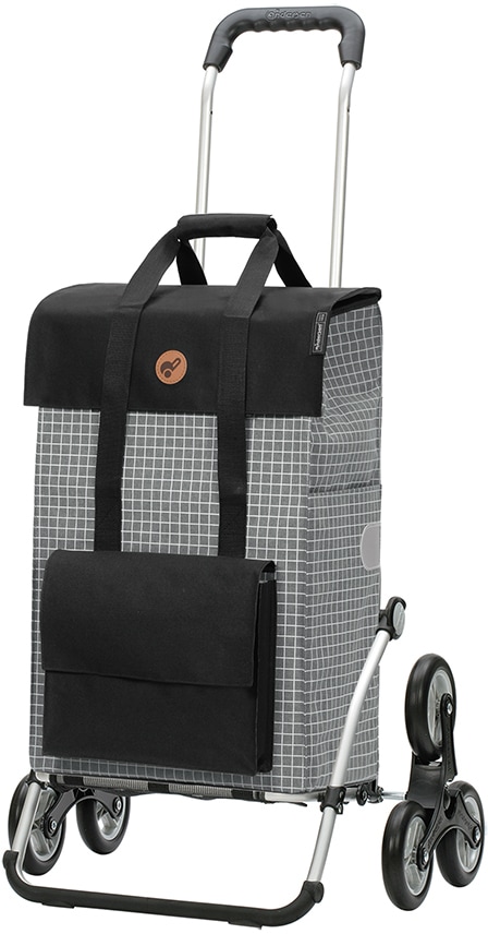 Bekleidung Mode - - Viele Treppenstufen können den Einkaufsweg oftmals erschweren. Unsere Treppensteiger Shopper® wie der Treppensteiger Royal Shopper meistern mit ihren drei großen Rädern jede Stufe problemlos. Die Flüsterräder sorgen zudem dafür, dass der Einkaufstrolley der Marke Shopper® auch auf unebenen Untergründen wie Kopfsteinpflaster sehr leise ist. Zusammen mit der Shopper® Tasche Hedda mit modischem Karomuster wird der Shopper® zu einem Hingucker. Die Shopper® Tasche bietet mit 51 Litern Fassungsvermögen ausreichend Platz für den Einkauf und eignet sich auch als Begleiter für den Ausflug zum See oder in den Park. Eine Innentasche und eine Seitentasche bieten zusätzlichen Stauraum für Portemonnaie, Schlüssel oder Zeitschriften. Die Tasche Hedda ist wasserabweisend und bei leichten Verschmutzungen einfach zu reinigen. Reflektoren an den Seiten sorgen auch bei Dunkelheit oder schlechtem Wetter für gute Sichtbarkeit., Material: Material: Aluminium, Material Griff: Kunststoff, Materialeigenschaften: wasserabweisend, Optik/Stil: Farbbezeichnung: grau, Optik: kariert, Applikationen: Logodruck, Reflektoren, Produktdetails: Ausstattung: Hängefix, Vorrichtung für Kupplungsset, Anzahl Hauptfächer: 1 Stk., Anzahl Seitentaschen: 1 Stk., Anzahl Vordertaschen: 1 Stk., Verschluss Hauptfach: Klettverschluss, Eigenschaften Griff: abklappbar, Zusatzausstattung: Tasche abnehmbar, Anzahl Rollen: 2, Art Rollen: Dreikranzrollen, Eigenschaften: Gestell zusammenlegbar, Stützfuß ... ![]() Einkaufstrolley ANDERSEN ''Royal Sh. Hedda'', grau, Aluminium, Einkaufskörbe, (Treppesteiger), inkl.
