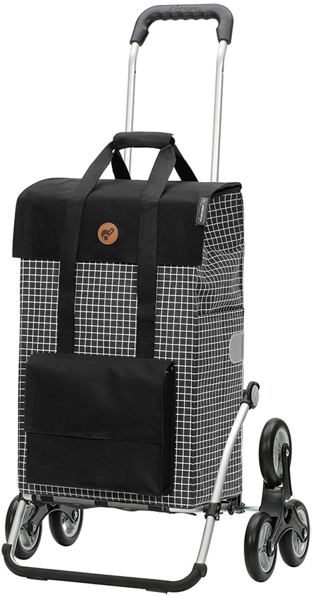 Einkaufsbeutel -körbe Mode Taschen Geldbörsen - - Viele Treppenstufen können den Einkaufsweg oftmals erschweren. Unsere Treppensteiger Shopper® wie der Treppensteiger Royal Shopper meistern mit ihren drei großen Rädern jede Stufe problemlos. Die Flüsterräder sorgen zudem dafür, dass der Einkaufstrolley der Marke Shopper® auch auf unebenen Untergründen wie Kopfsteinpflaster sehr leise ist. Zusammen mit der Shopper® Tasche Hedda mit modischem Karomuster wird der Shopper® zu einem Hingucker. Die Shopper® Tasche bietet mit 51 Litern Fassungsvermögen ausreichend Platz für den Einkauf und eignet sich auch als Begleiter für den Ausflug zum See oder in den Park. Eine Innentasche und eine Seitentasche bieten zusätzlichen Stauraum für Portemonnaie, Schlüssel oder Zeitschriften. Die Tasche Hedda ist wasserabweisend und bei leichten Verschmutzungen einfach zu reinigen. Reflektoren an den Seiten sorgen auch bei Dunkelheit oder schlechtem Wetter für gute Sichtbarkeit., Material: Material: Aluminium, Material Griff: Kunststoff, Materialeigenschaften: wasserabweisend, Optik/Stil: Farbbezeichnung: schwarz, Optik: kariert, Applikationen: Logodruck, Reflektoren, Produktdetails: Ausstattung: Hängefix, Vorrichtung für Kupplungsset, Anzahl Hauptfächer: 1 Stk., Anzahl Seitentaschen: 1 Stk., Anzahl Vordertaschen: 1 Stk., Verschluss Hauptfach: Klettverschluss, Eigenschaften Griff: abklappbar, Zusatzausstattung: Tasche abnehmbar, Anzahl Rollen: 2, Art Rollen: Dreikranzrollen, Eigenschaften: Gestell ... ![]() ![]() Einkaufstrolley ANDERSEN 'Royal Sh. Hedda', schwarz, Aluminium, Einkaufskörbe, (Treppesteiger), inkl.