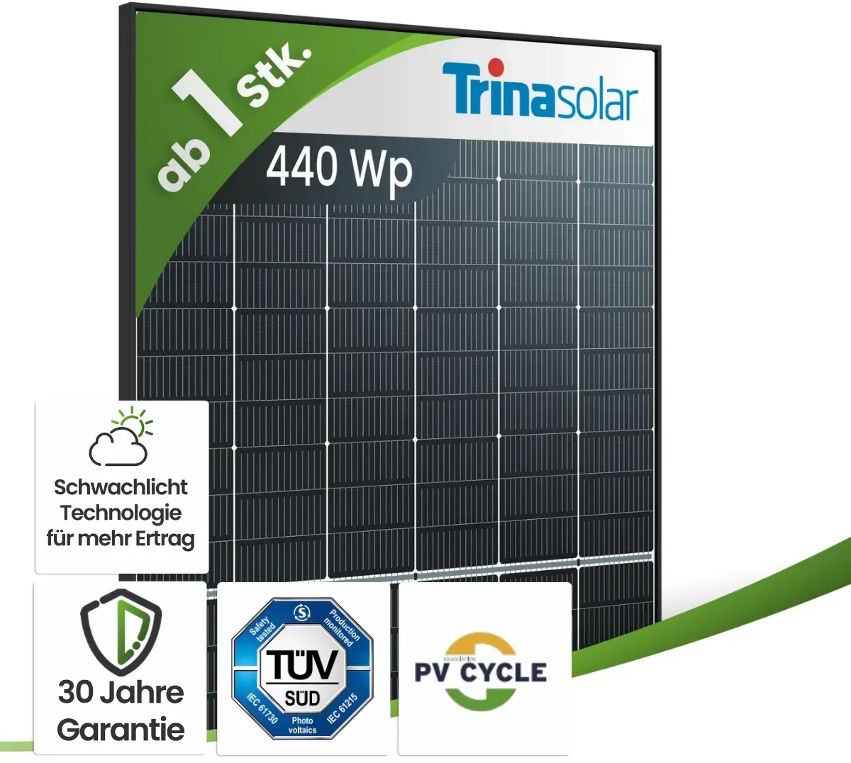 Kategorie: Solarpanele - Trina Solar - Trina Vertex S+ bifaziales Doppelglas 440WpMAXIMALE NENNLEISTUNG0/+5 WPOSITIVE LEISTUNGSTOLERANZ22,0%MAXIMALER WIRKUNGSGRAD Kleine Maße, große LeistungBis zu 440 W Spitzenleistung, 22,0 % ModulwirkungsgradBifazialitätsfaktor bis 85 %Besseres Temperaturverhalten bei hohen Umgebungstemperaturen für mehr Leistung Transparentes Doppelglas KonzeptEntwickelt mit Fokus auf sthetikAusgezeichnete Beständigkeit gegen Feuer und bei schwierigen Umweltbedingungen5.400 Pa Scheelast und 4.000 Pa Windlast (Testlasten) Universelle L sung für Wohn- und GewerbedächerHohe Kompatibilität mit verfügbaren Wechselrichtern, Optimierern und MontagesystemenLeichte Handhabung durch perfekte Gr ße und geringes Gewicht Technische Daten: - 75,00 Euro bei tepto.de - gefunden von billiger.de Dieses 440Wp Bifazial Black Frame PV Solarmodul für 79.90 Euro ist ein solides Einzelangebot mit guter Leistung. ![]() ![]() Trina NEG9RC.27 - 440Wp Bifazial eBay Black Frame PV Solarmodul Solarpanel Glas-Glas