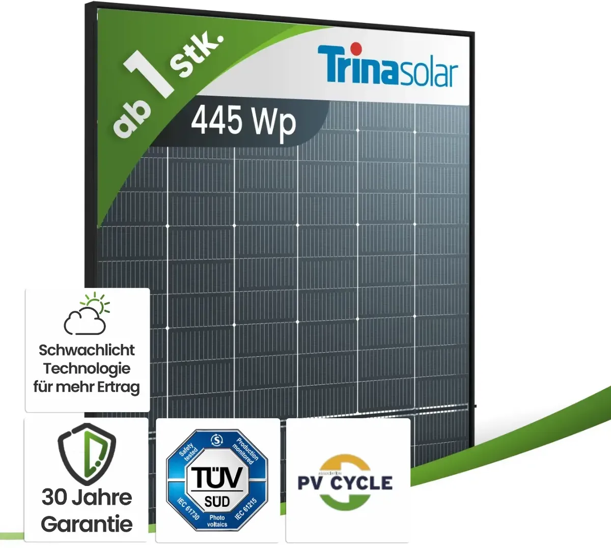 Kategorie: Solarpanele - Trina Solar - GTIN:4251842814645 - Trina Vertex S+ bifaziales Doppelglas 445WpMAXIMALE NENNLEISTUNG0/+5 WPOSITIVE LEISTUNGSTOLERANZ22,3%MAXIMALER WIRKUNGSGRAD Kleine Maße, große LeistungBis zu 445 W Spitzenleistung, 22,3 % ModulwirkungsgradBifazialitätsfaktor bis 85 %Besseres Temperaturverhalten bei hohen Umgebungstemperaturen für mehr Leistung2 Produkt auf die Verarbeitung und 3 Leistungs N-typ Technologie mit 1 % Degradation im ersten Jahr und 0,4 % in den Jahren 2 ä 30 Transparentes Doppelglas KonzeptEntwickelt mit Fokus auf sthetikAusgezeichnete Beständigkeit gegen Feuer und bei schwierigen Umweltbedingungen5.400 Pa Scheelast und 4.000 Pa Windlast (Testlasten) Universelle L sung für Wohn- und GewerbedächerHohe Kompatibilität mit verfügbaren Wechselrichtern, Optimierern und MontagesystemenLeichte Handhabung durch perfekte Gr ße und geringes Gewicht Technische Daten: - 66,99 Euro bei tepto.de - gefunden von billiger.de Dieses 445W Glas-Glas Bifacial Modul für 72 Euro ist ein leistungsstarkes Einzelmodul zu einem fairen Preis. ![]() ![]() Solarpanel 445W - Trina Vertex eBay S+ Bifacial TSM-445NEG9RC.27 Glas-Glas