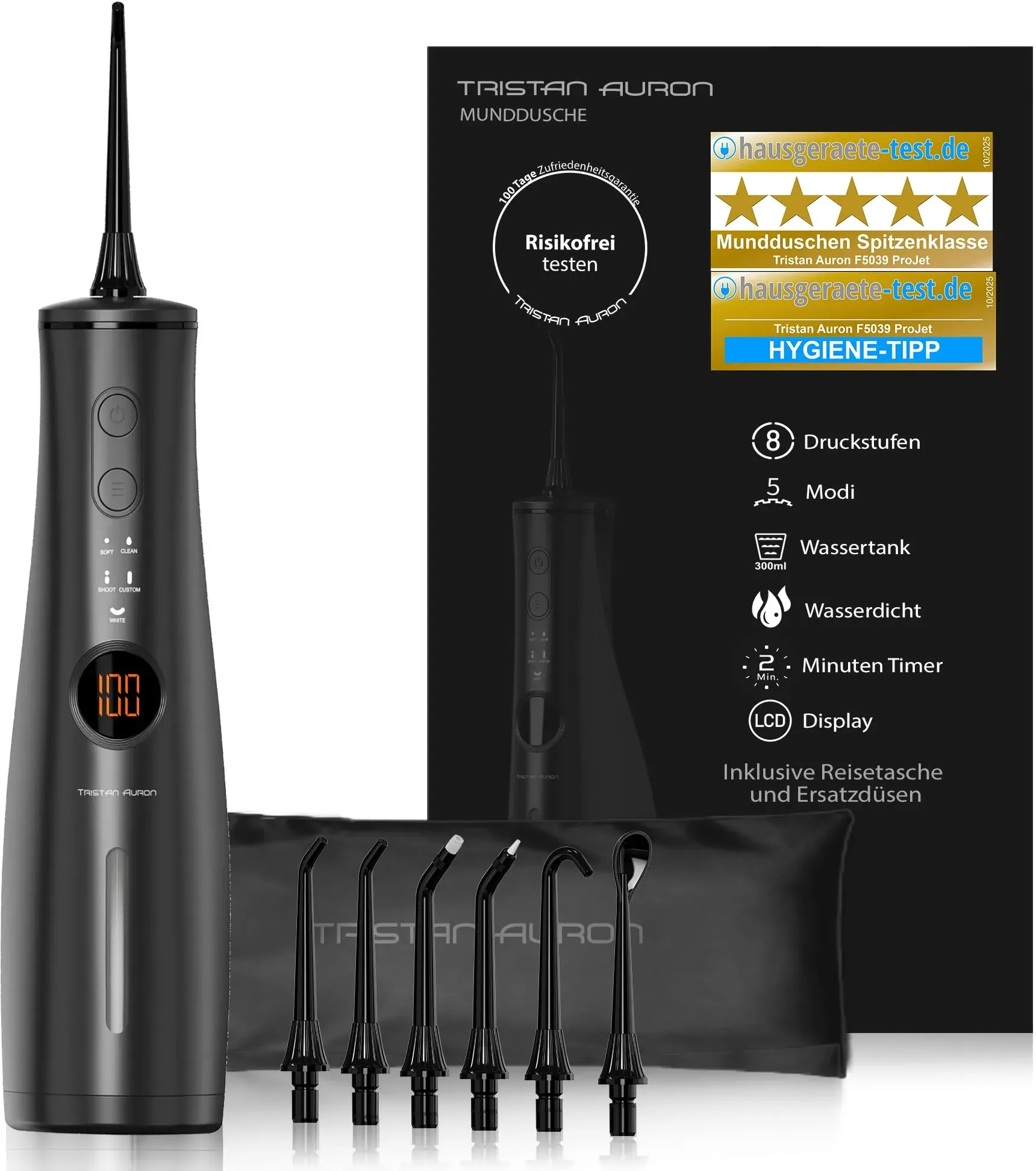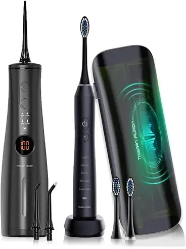 Verfügbarkeit: Auf Lager - Kategorie: Elektrische Zahnbürsten - Tristan Auron - GTIN:4260287215382 - 1. Komplettes Zahnpflege-Set €“ Enthält die Tristan Auron Business Class Schallzahnbürste, die Projet Munddusche und ein praktisches UV-Case zur hygienischen Aufbewahrung von Bürstenköpfen. 2. Tiefenreinigung & Zahnfleischschutz €“ Schalltechnologie mit 55.000 Vibrationen/min und 5 Modi kombiniert mit 8 Druckstufen der Munddusche für saubere Zähne und gesundes Zahnfleisch. 3. Großzügiger 300 ml Wassertank €“ Weniger Nachfüllen dank extra großem Tank der Munddusche. Shoot-Modus für gezielte Reinigung spart bis zu 70 % Wasser. 4. Moderne Features für Komfort €“ LCD-Display, 2-Minuten-Timer, USB-C Schnellladung und bis zu 60 Tage Akkulaufzeit €“ ideal für zuhause und unterwegs. 5. Umfangreicher Lieferumfang €“ Inklusive 2 Bürstenaufsätzen, 6 Ersatzdüsen (Standard, Parodontose, U-förmig, Zungenschaber), UV-Reiseetui, USB-C Kabel und Bedienungsanleitung. - 99,90 Euro bei Amazon Marketplace Automotive - gefunden von billiger.de Ein Doppelpack elektrischer Zahnbürsten mit UV-Reiseetui, das Hygiene und Komfort auf Reisen bietet. ![]() ![]() Tristan Auron Elektrische Zahnbürste Elektrische Zahnbürste Doppelpack + UV Reiseetui - 60 Tage Akku IPX7, Aufsteckbürsten: 4 St. blau