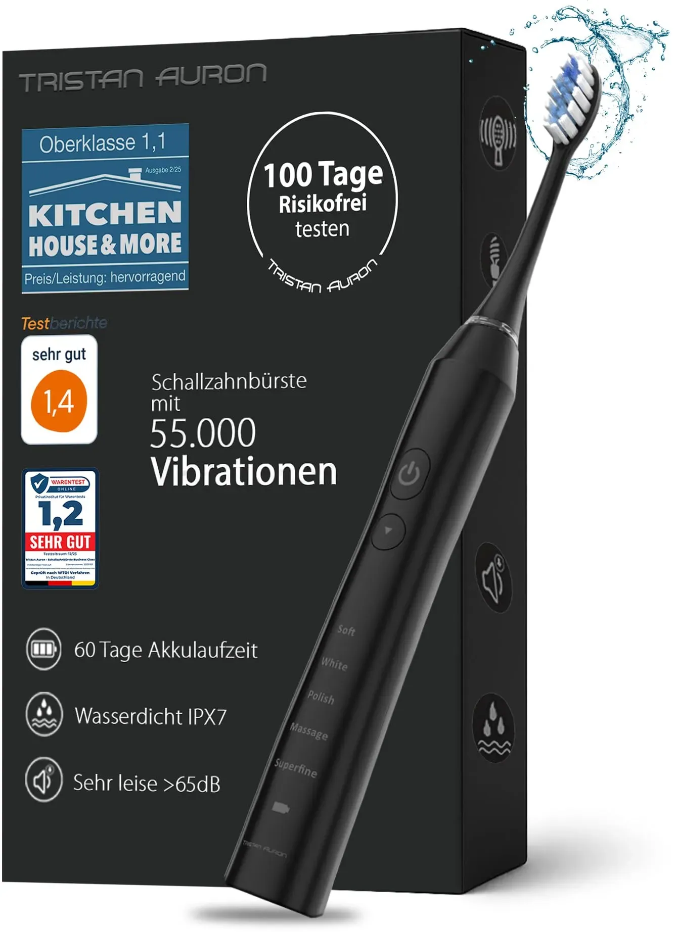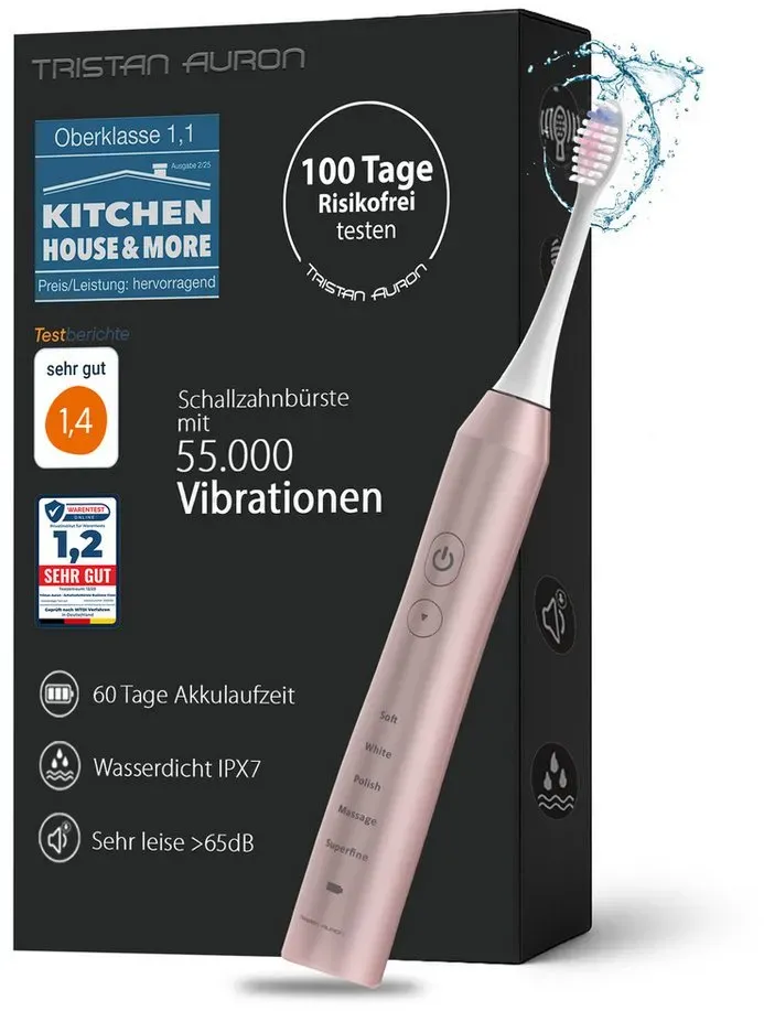 Die beliebtesten Modelle sind die Business Class UV Edition und die SonicMaster UV Edition[3][5]. Dampfbügelstationen sind die zweite Produktkategorie[1]. Tristan Auron bietet hier zwei Modelle an: | Merkmal | SuperFast | Elite | |---------|-----------|-------| | Leistung | 2.800 Watt | 2.400 Watt | | Dampfdruck | 6,5 bar | 8 bar | | Dampfmenge | bis 160 g/min | bis 155 g/min | | Wassertank | 1,7 Liter | 2,0 Liter | Preisbereich und PositionierungDie Schallzahnbürsten bewegen sich im Budget- bis Mittelpreissegment mit Preisen um 77-105 Euro[3][5]. Die Dampfbügelstationen sind ebenfalls preisgünstig positioniert und richten sich an Haushalte mit kleinerem Budget[1]. Wichtig zu wissen: Tristan Auron positioniert sich als Preis-Leistungs-Alternative zu etablierten Marken. Bei den Dampfbügelstationen wird explizit erwähnt, dass bekannte Hersteller wie Tefal oder Philips bei ähnlichen technischen Werten bessere Bügeleigenschaften bieten, allerdings zu höheren Preisen (ab ca. 200 Euro)[1]. Worauf Sie achten sollten